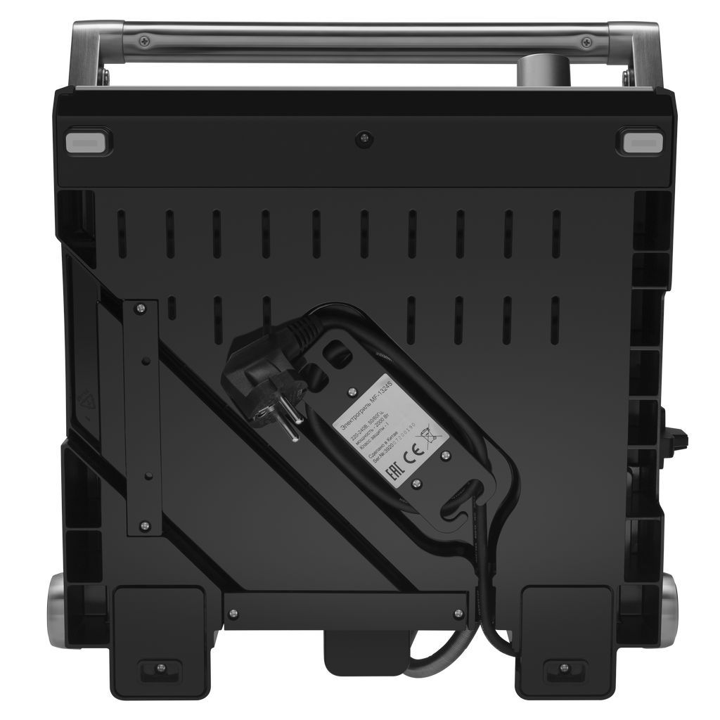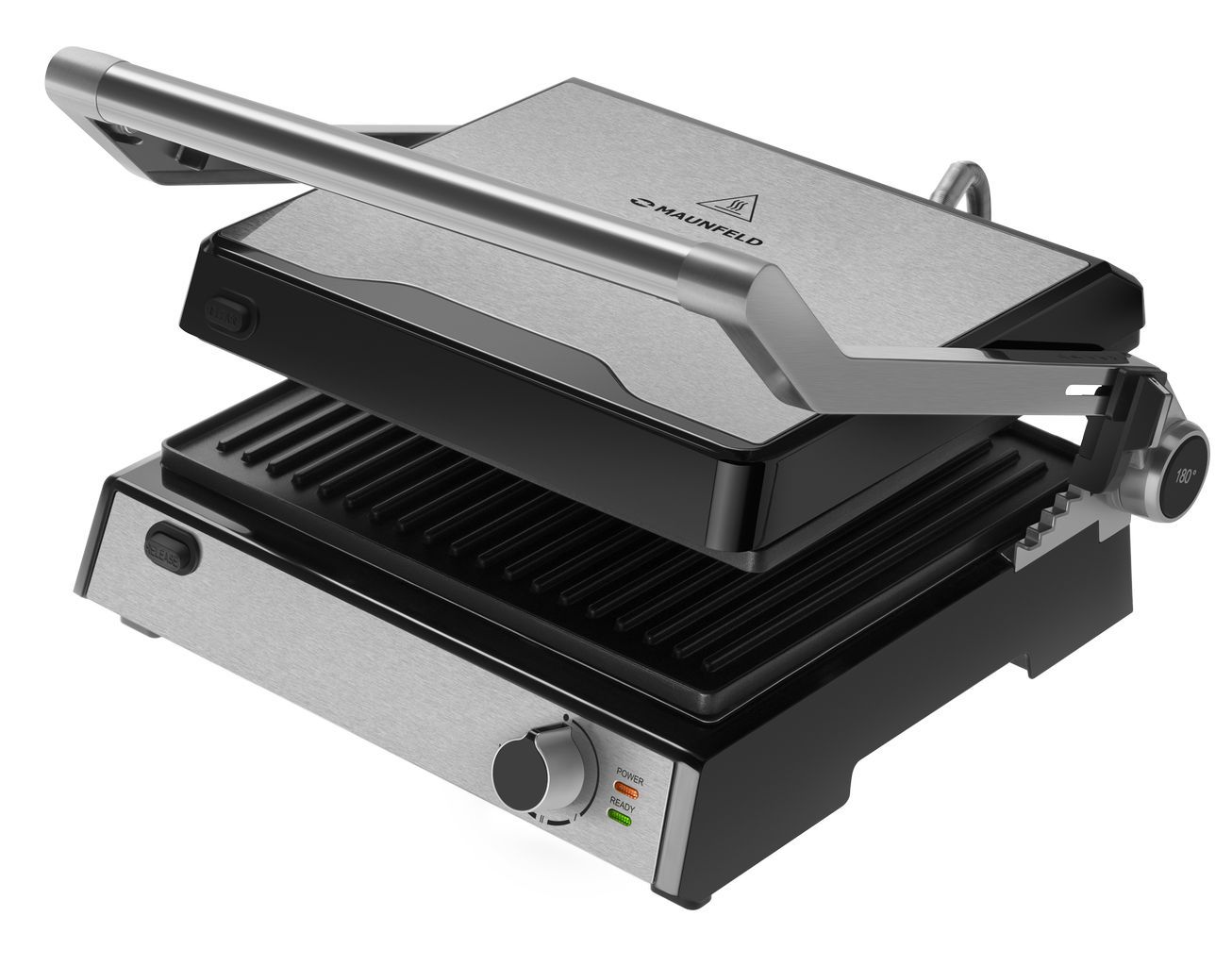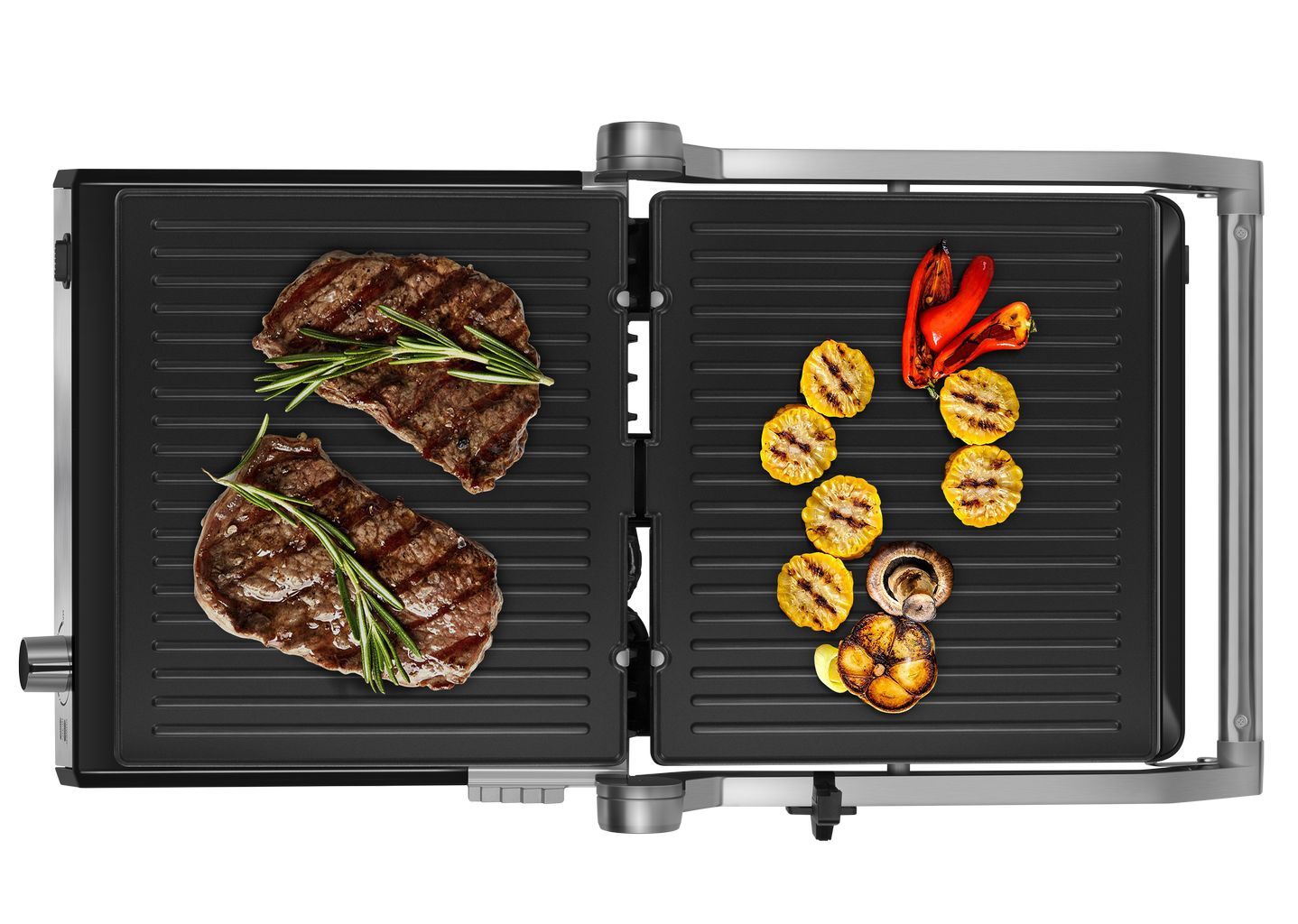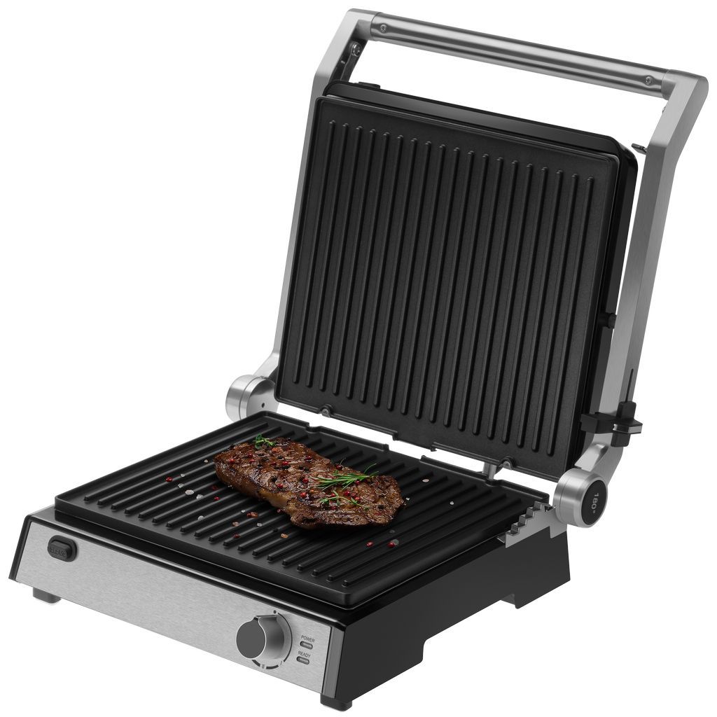 Современный электрический гриль из нержавеющей стали с тремя режимами работы. Съемные поддон для сбора жира и панели с антипригарным покрытием.