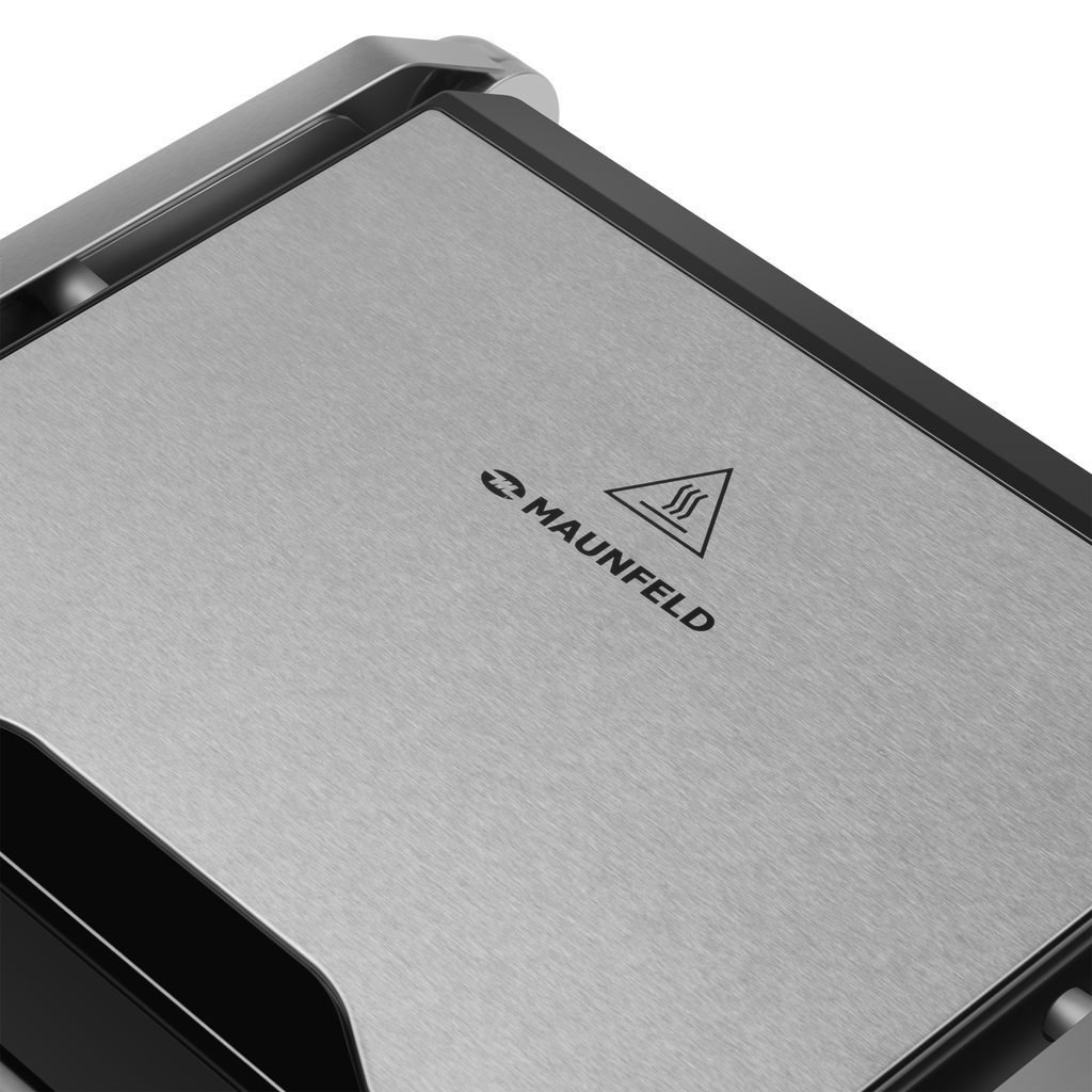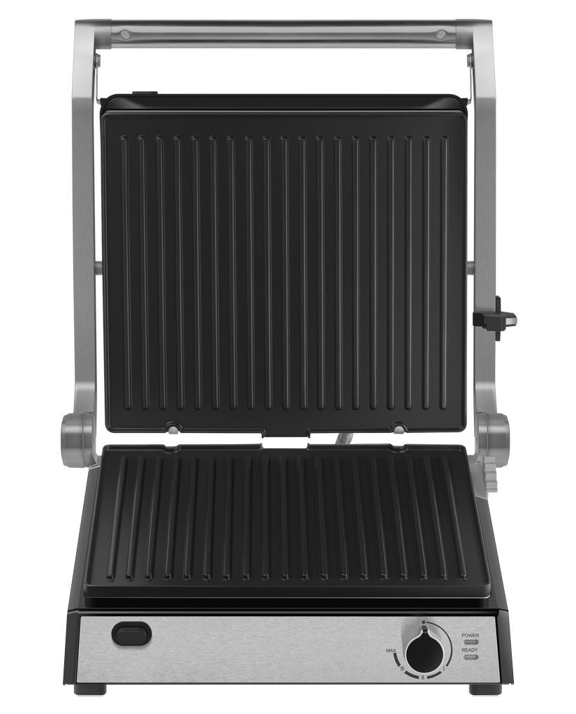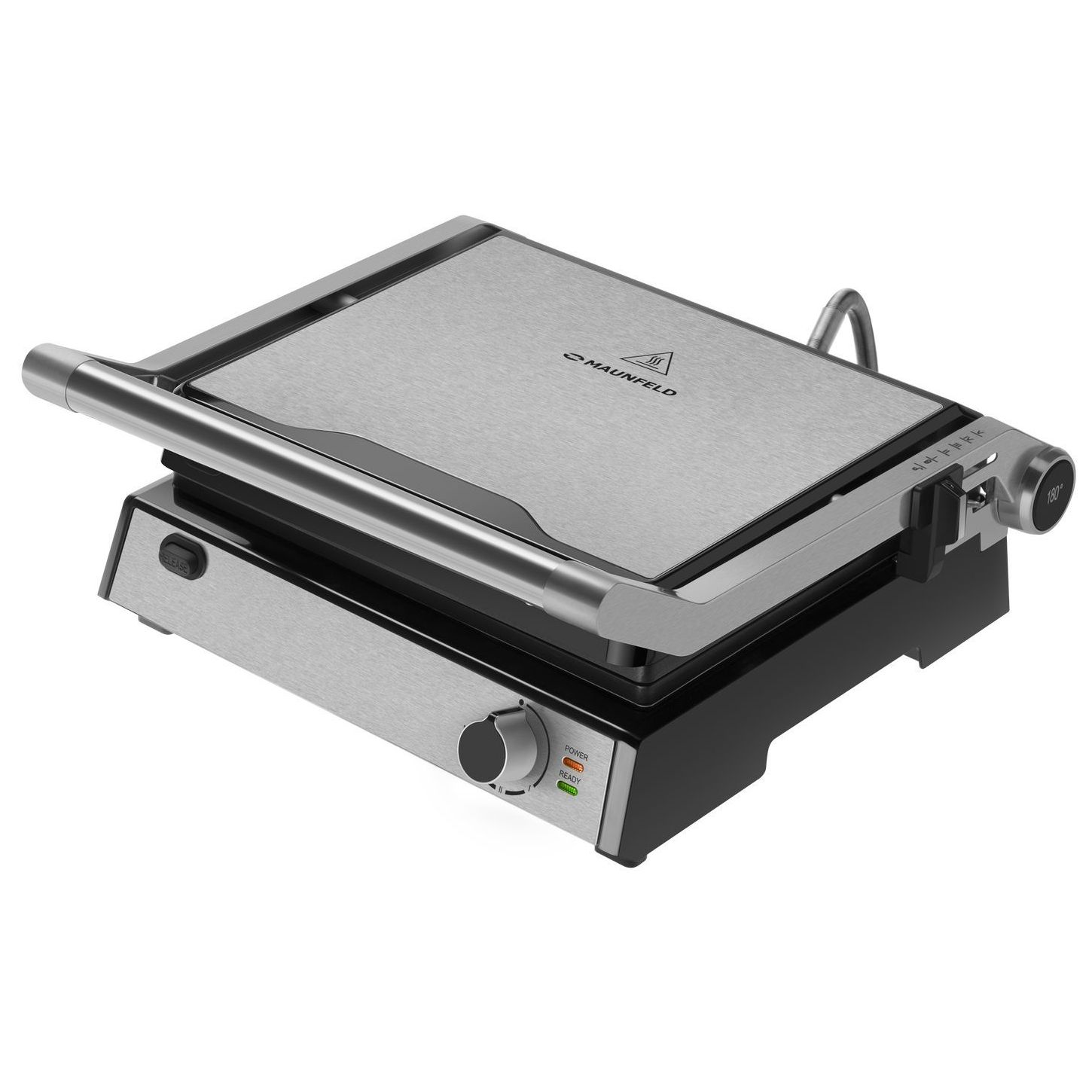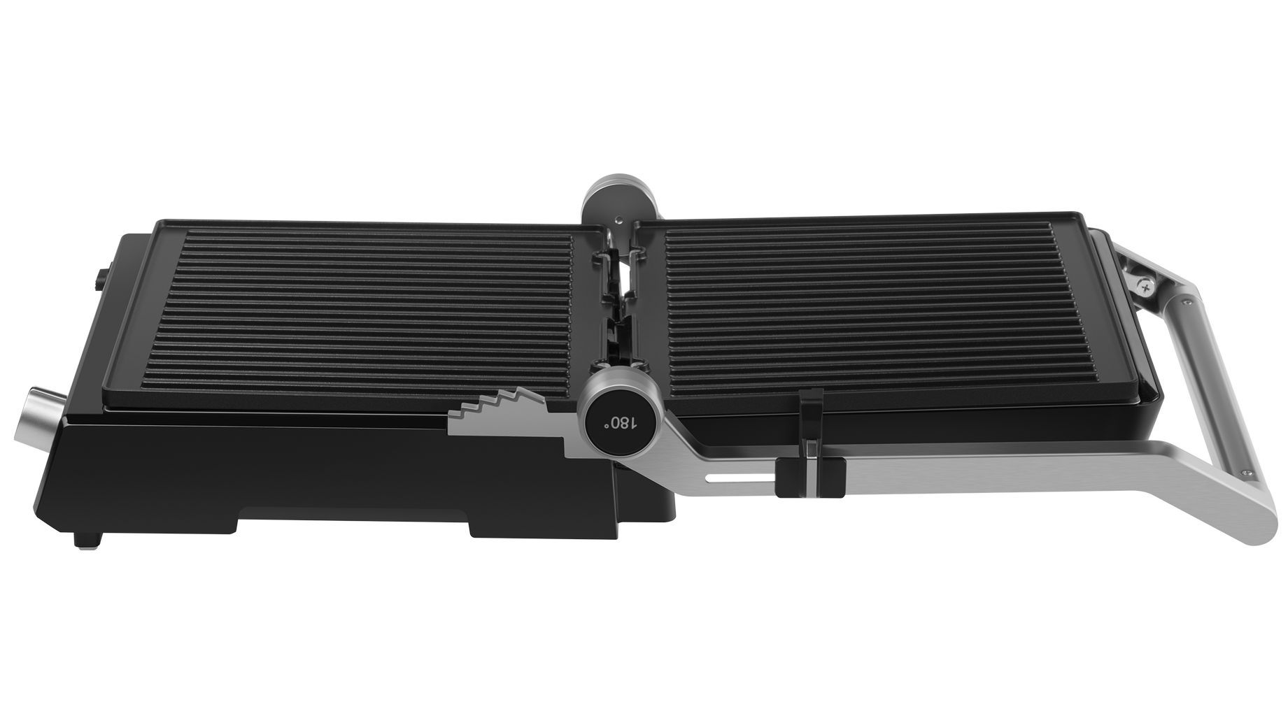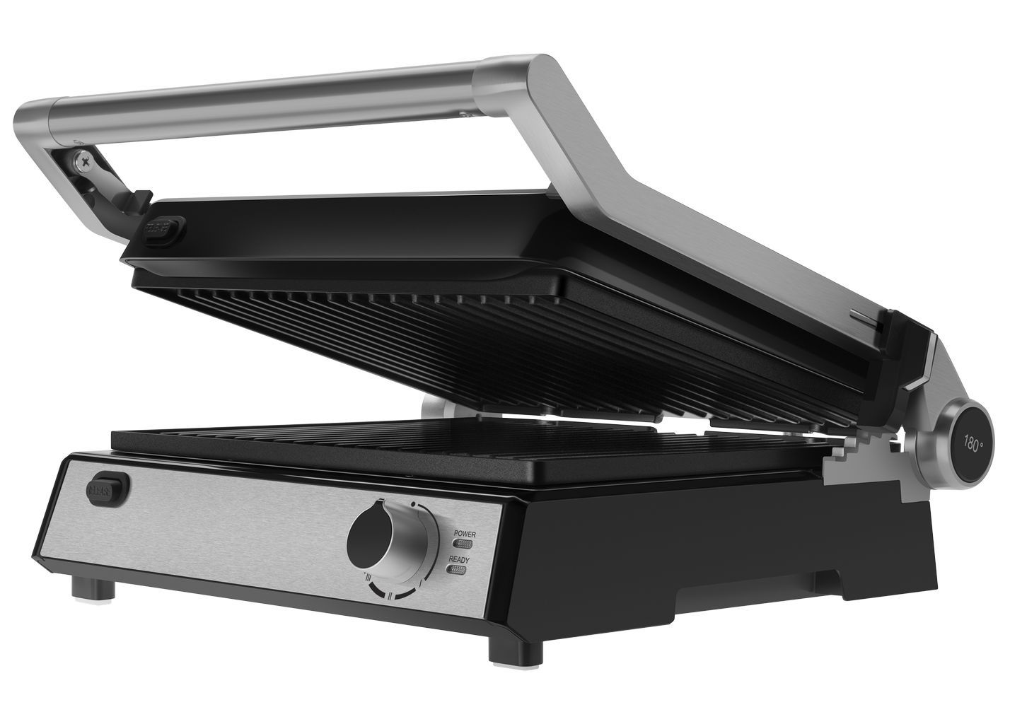 Современный электрический гриль из нержавеющей стали с тремя режимами работы. Съемные поддон для сбора жира и панели с антипригарным покрытием.