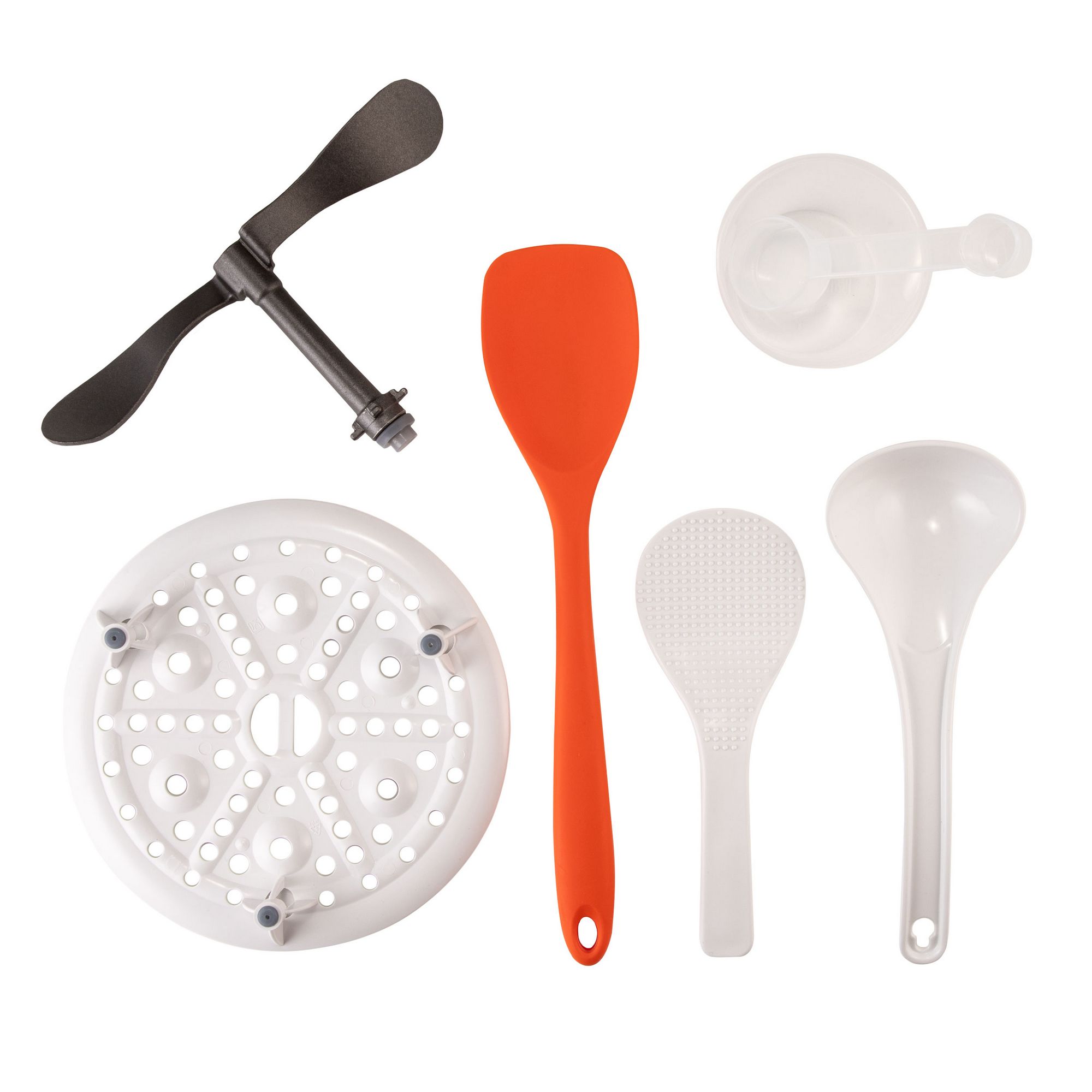 В комплекте: вращающаяся лопатка для перемешивания, паровая полочка, мерный стакан, силиконовая лопатка, ложка, половник.