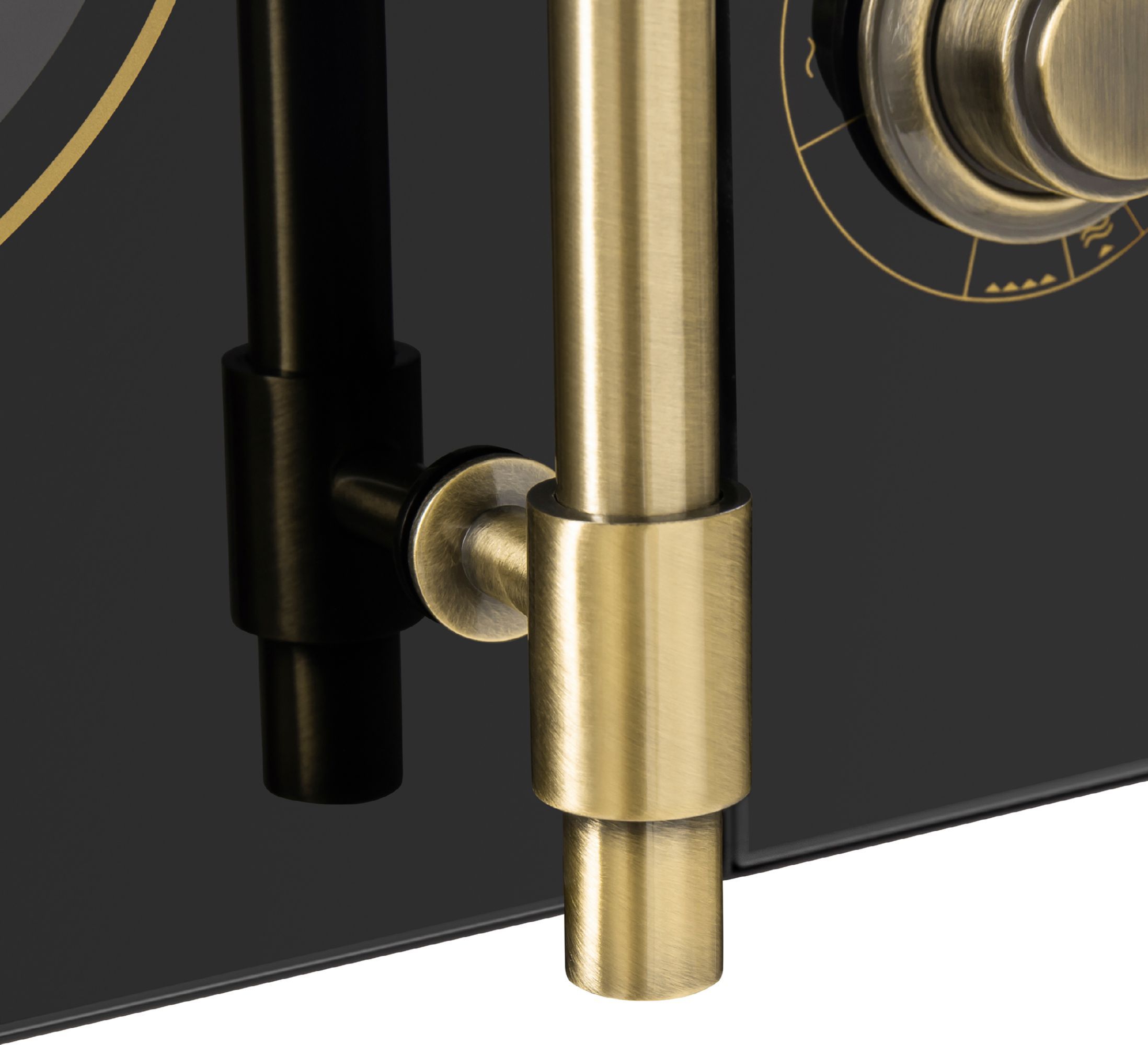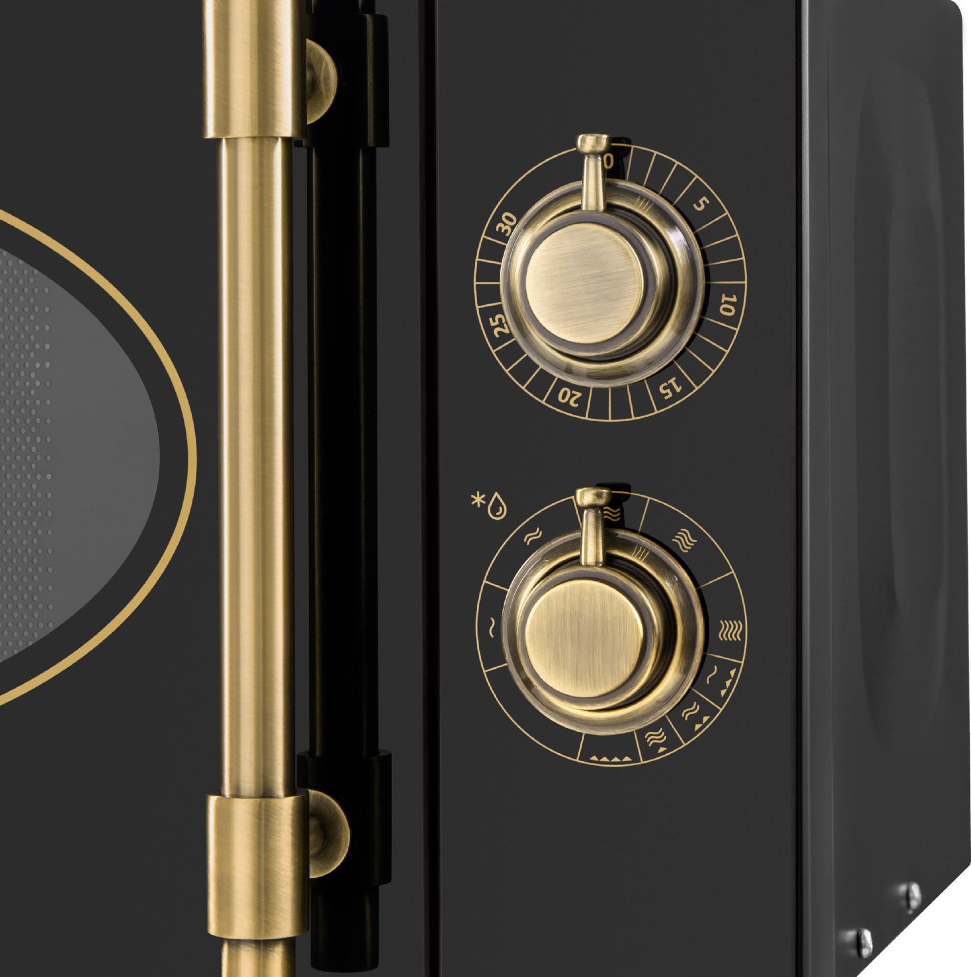 Отдельностоящая микроволновая печь мощностью 1080 Вт выполнена в ретро-стиле. Стеклянная черная дверца прекрасно сочетается с металлическими ручками цвета патинированного золота. Ширина плиты всего 45 см, что позволяет поместить ее в любой кухне.