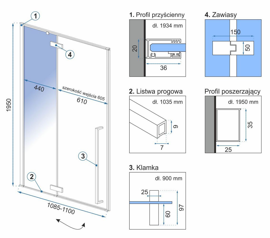 Распашная душевая дверь с неподвижной стенкой в линии. Профиль черный матовый.