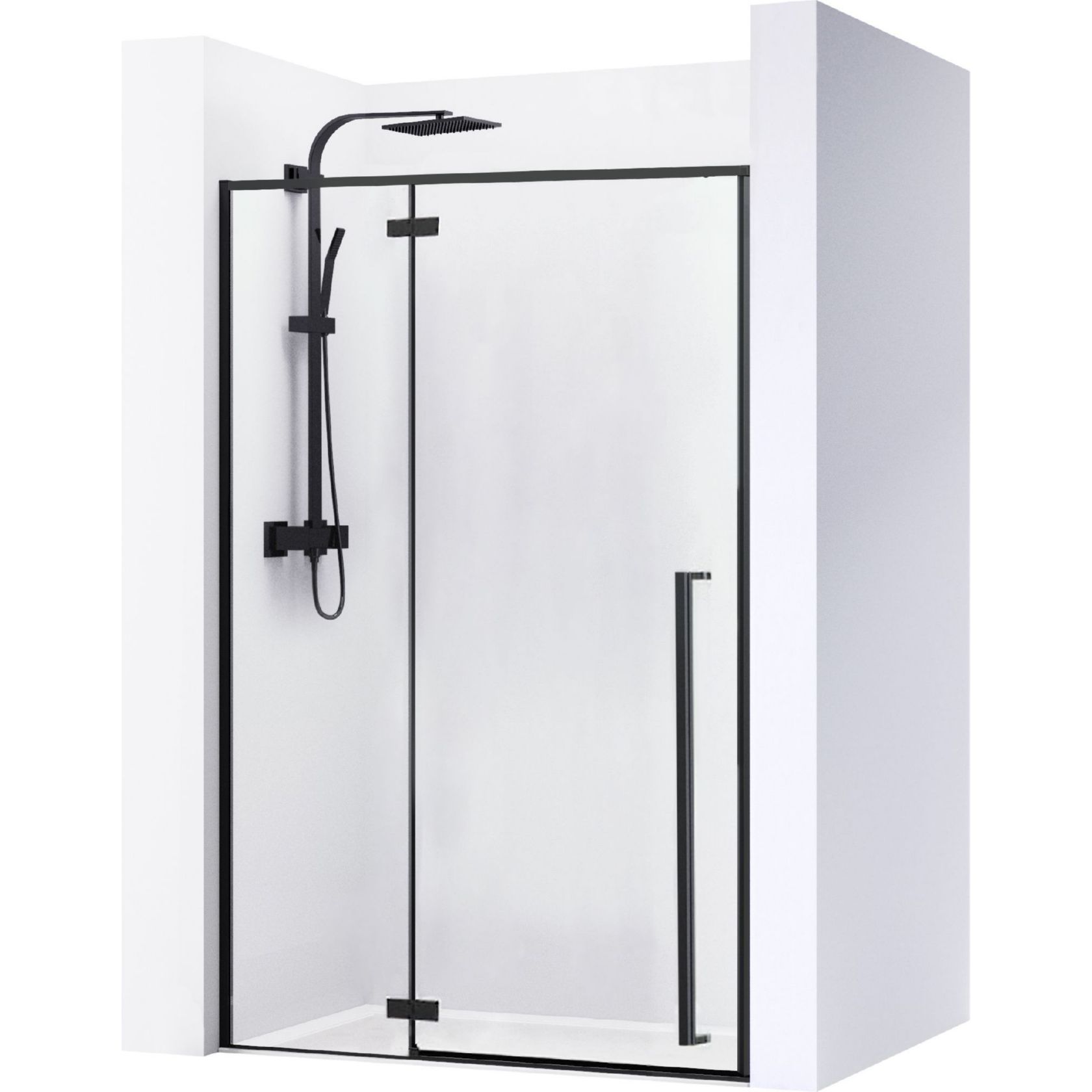 Распашная душевая дверь с неподвижной стенкой в линии. Профиль черный матовый.