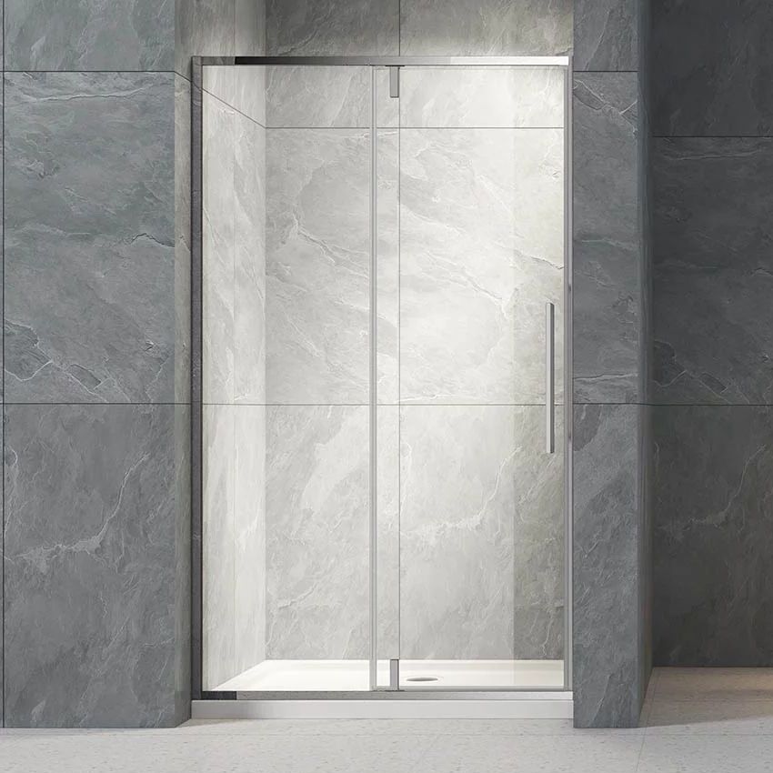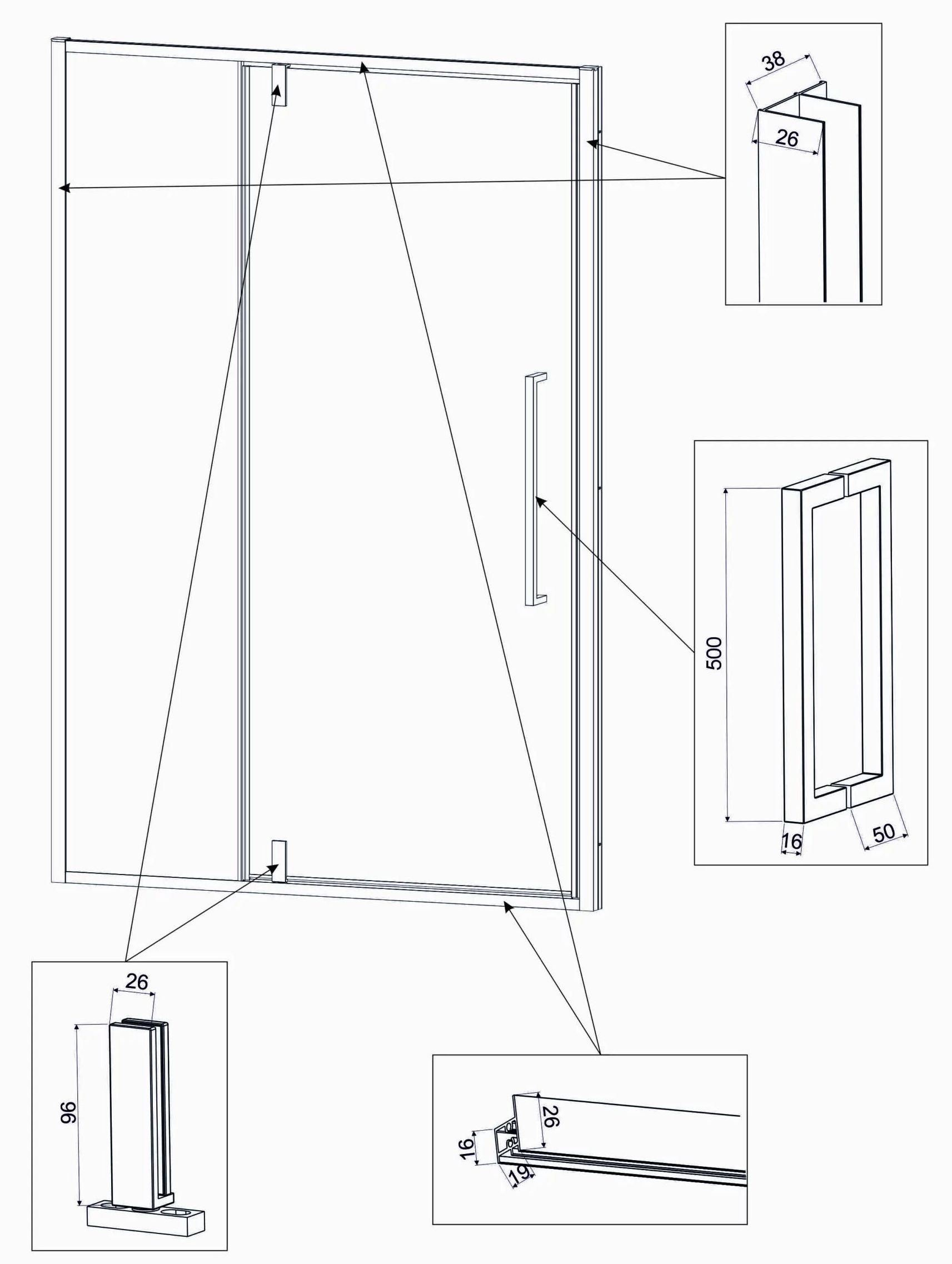 Душевая дверь распашная. Стекло закаленное безопасное 6 мм. Магнитные уплотнители. Профиль анодированный алюминий. Петли из нержавеющей стали. Двусторонняя ручка-скоба из нержавеющей стали. Универсальная установка открывания двери. Поддон приобретается отдельно. Комплектуется боковой панелью KP-12, образую душевой угол RV-034.