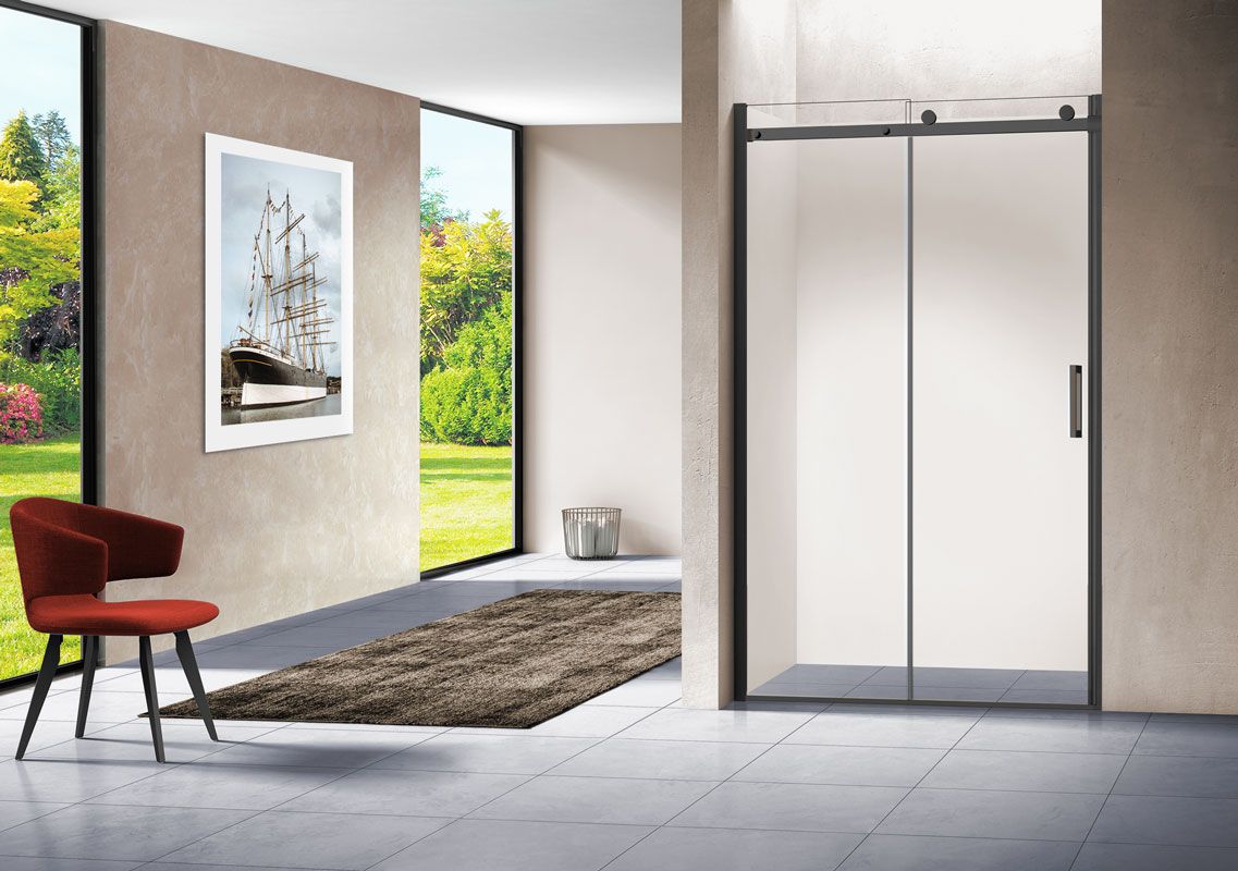 Раздвижная душевая дверь из безопасного закаленного стекла толщиной 8 мм. Высота двери 195 см. Диапазон регулировки -2.5 +0.5 см. Черный матовый профиль из алюминия.