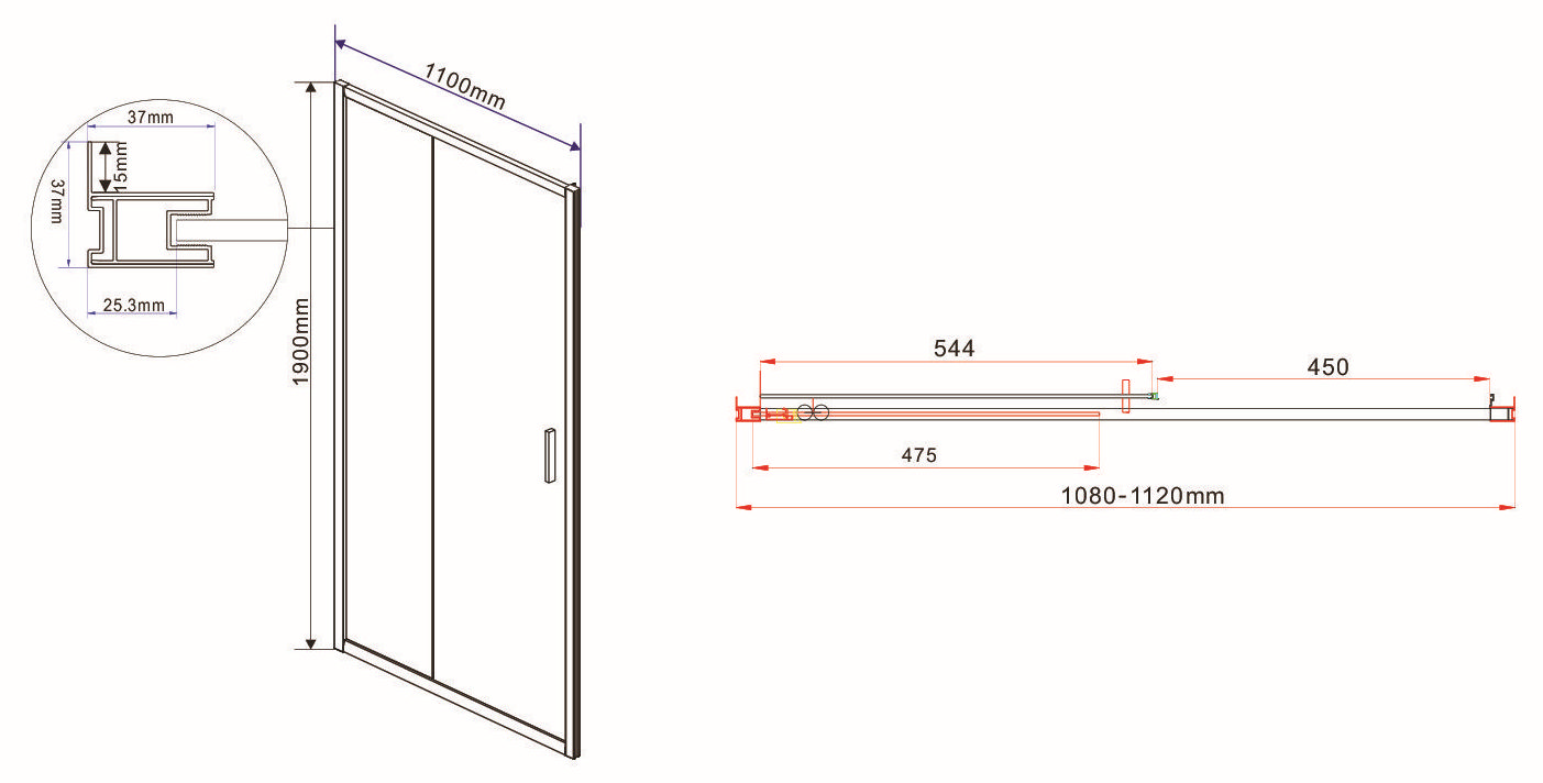 Душевая дверь из безопасного закаленного стекла толщиной 6 мм. Высота двери 190 см. Регулировка ±2 см. Хромированный профиль из алюминия.