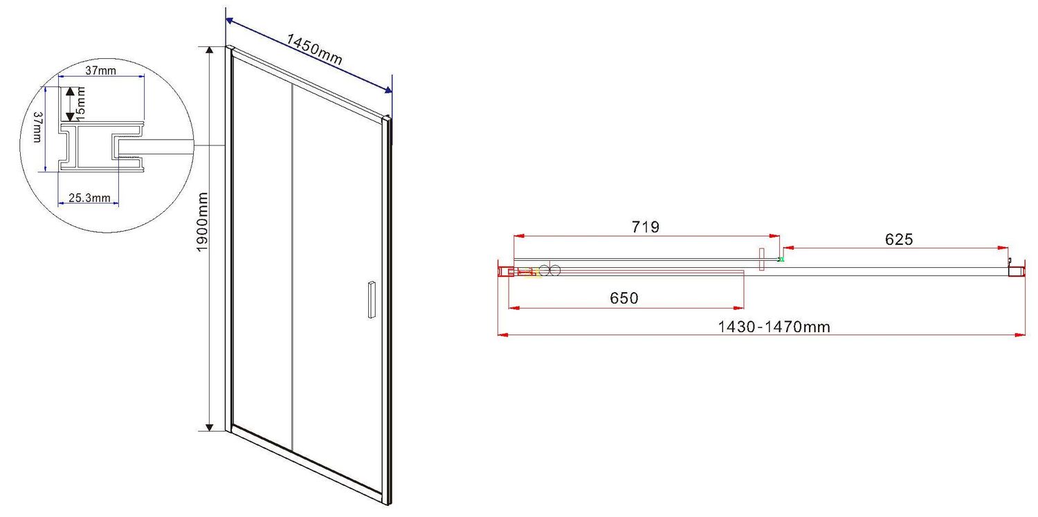 Душевая дверь из безопасного закаленного стекла толщиной 6 мм. Высота двери 190 см. Регулировка ±2 см. Хромированный профиль из алюминия.