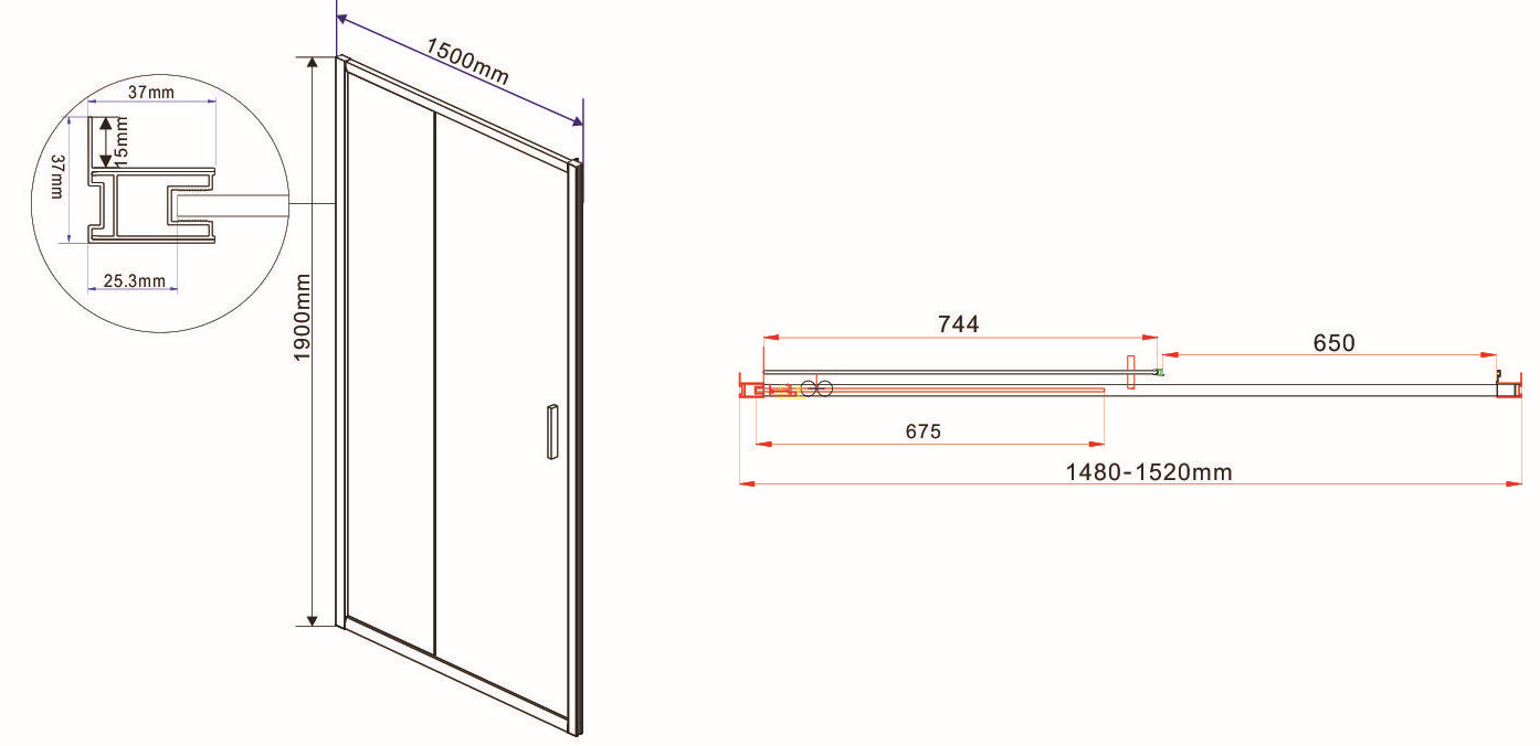Душевая дверь из безопасного закаленного стекла толщиной 6 мм. Высота двери 190 см. Регулировка ±2 см. Хромированный профиль из алюминия.