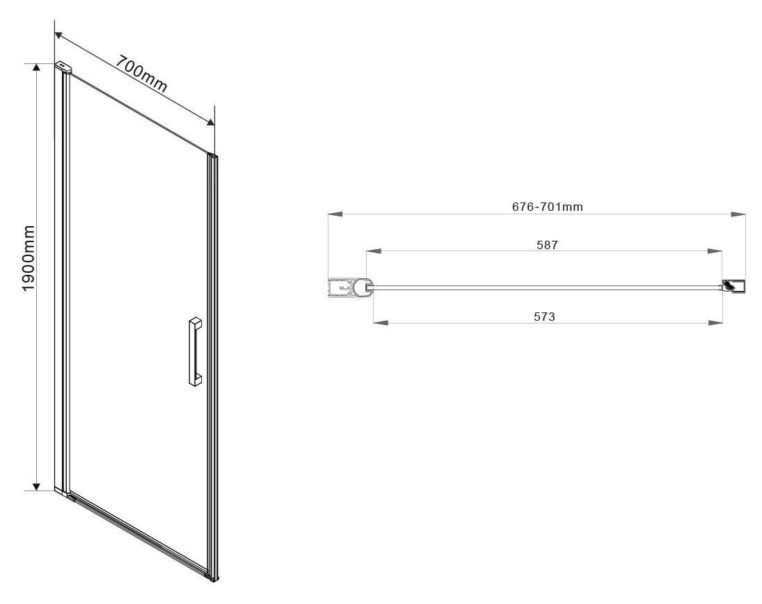 Распашная душевая дверь из безопасного закаленного стекла толщиной 6 мм. Высота двери 190 см. Регулировка -2.4 см. Хромированный профиль из алюминия.