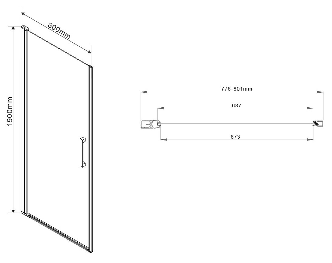 Распашная душевая дверь из безопасного закаленного стекла толщиной 6 мм. Высота двери 190 см. Регулировка -2.4 см. Черный матовый профиль из алюминия.