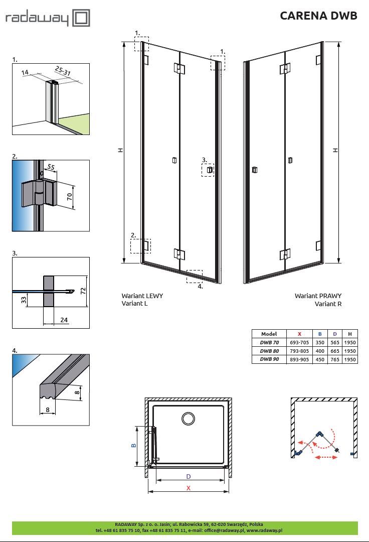 Складная дверь для душевой ниши. Безопасное закалённое стекло толщиной 6 мм, согласно стандарту PN:EN 12150:1. Стекло крепится к стене с помощью пристенных профилей (с регулировкой). Полотенцедержатель подходит к всем полотенцам. Подъемно-опускной механизм гарантирует тихое открывание двери и долгосрочную службу нижнего уплотнителя. Элегантная хромированная фурнитура. Магнитный уплотнитель обеспечивает герметичность кабины. Эту душевую кабину возможно установить так на поддоне, как и непосредственно на пол. Защитное покрытие помогает содержать чистоту на поверхности стекол. Благодаря водоотталкивающим свойствам капли воды не удерживаются на поверхности стекла и быстро стекают, не оставляя следа. Это изделие подлежит модификациям. Изделие доступно в нескольких вариантах стекла. Возможность сделать гравировку на стекле. Применение расширительных профилей увеличит габаритный размер душевой кабины либо двери на размер указанный в пиктограмме.