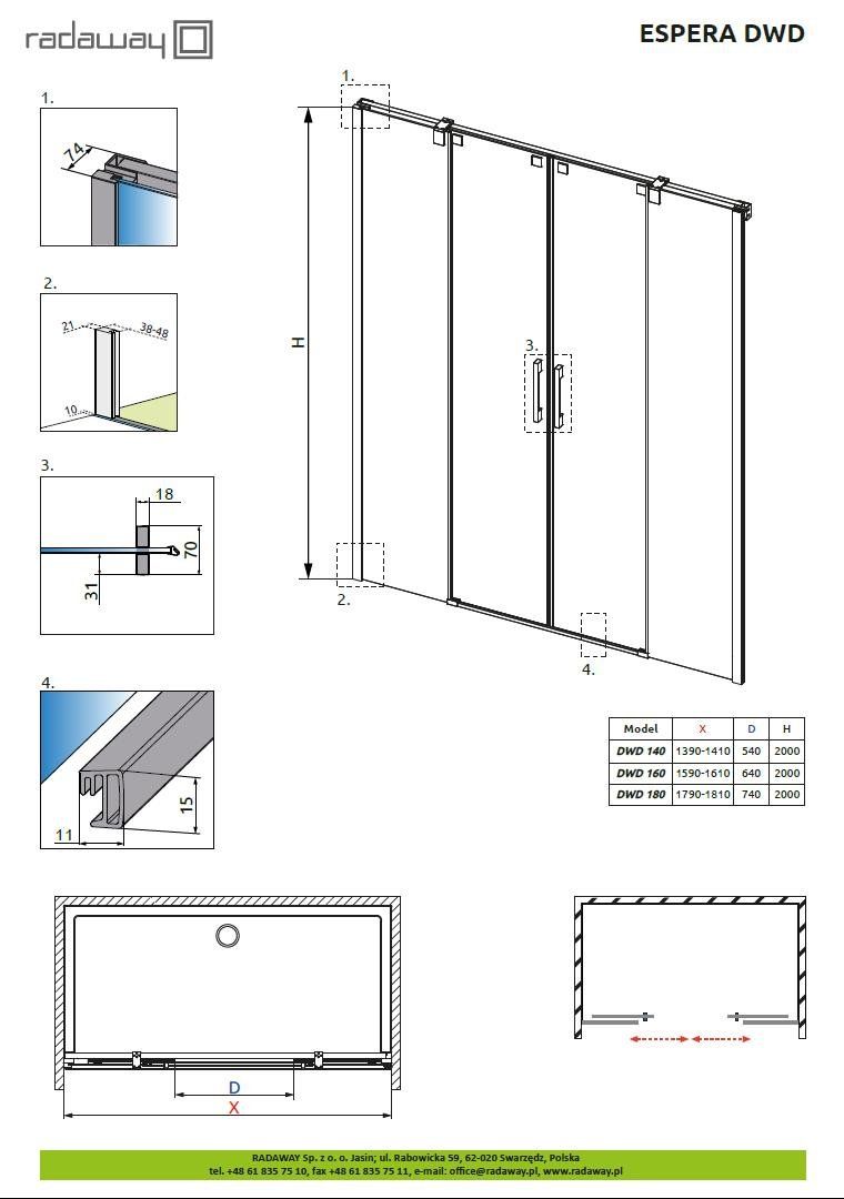 Коллекция Espera это набор кабин и дверей в нишу которые отличаются надежностью и стилем. Espera создана для у потребителей, которые точно знают чего хотят от жизни. Коллекция получила несколько призов от читателей разных журналов. Все изделия из этой коллекции допускается устанавливать как на поддон так и непосредственно на пол. Кроме того, все изделия допускается устанавливать с порогом или без порога меняя нижний фиксатор (в комплекте).