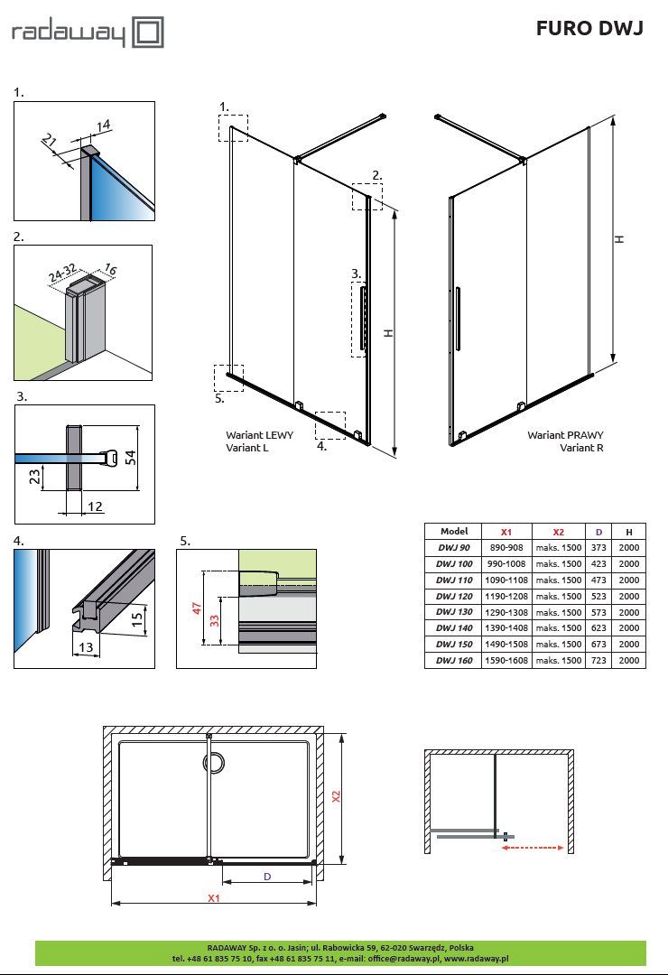 Безопасное закалённое стекло толщиной 8 мм, согласно стандарту PN:EN 12150:1. Стекло крепится к стене с помощью пристенных профилей (с регулировкой). Крепеж-фиксатор с инновационным тормозом раздвижного стекла. Крепеж-фиксатор с инновационным тормозом раздвижного стекла. Защитное покрытие помогает содержать чистоту на поверхности стекол. Благодаря водоотталкивающим свойствам капли воды не удерживаются на поверхности стекла и быстро стекают, не оставляя следа. Изделие доступно в нескольких вариантах стекла. Это изделие подлежит модификациям. Возможность сделать гравировку на стекле. Ширину входа можно увеличить на 30мм заменив вертикальную дверную ручку на врезную ручку (только хром / black). Замену ручки оформляется через конфигуратор.