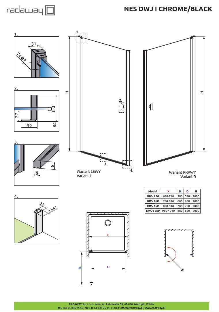 Распашная дверь для душевой ниши. Безопасное закалённое стекло толщиной 6 мм, согласно стандарту PN:EN 12150:1. Стекло крепится к стене с помощью пристенных профилей (с регулировкой). Цилиндрическая петля позволяет открывать дверь как наружу, так и внутрь. Подъемно-опускной механизм гарантирует тихое открывание двери и долгосрочную службу нижнего уплотнителя. Защитное покрытие помогает содержать чистоту на поверхности стекол. Благодаря водоотталкивающим свойствам капли воды не удерживаются на поверхности стекла и быстро стекают, не оставляя следа. Это изделие подлежит модификациям. Изделие доступно в нескольких вариантах стекла. Возможность сделать гравировку на стекле.