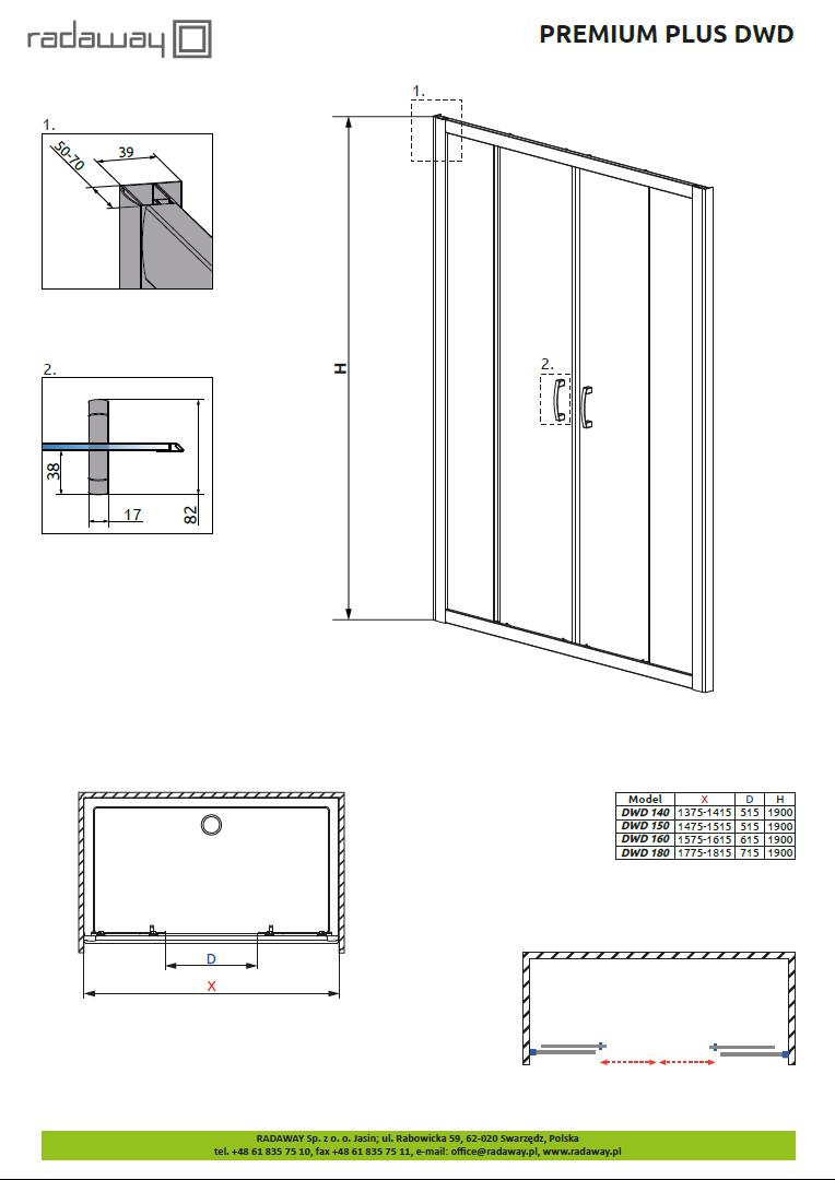 Раздвижные двери для душевой ниши. Безопасное закалённое стекло толщиной 5 мм, согласно стандарту PN:EN 12150:1. Стекло крепится к стене с помощью пристенных профилей (с регулировкой). Подшипниковые, двойные ролики с хромированной крышкой. Элегантная хромированная фурнитура. Магнитный уплотнитель обеспечивает герметичность кабины. Эту душевую кабину возможно установить так на поддоне, как и непосредственно на пол. Защитное покрытие помогает содержать чистоту на поверхности стекол. Благодаря водоотталкивающим свойствам капли воды не удерживаются на поверхности стекла и быстро стекают, не оставляя следа. Применение расширительных профилей увеличит габаритный размер душевой кабины либо двери на размер указанный в пиктограмме.