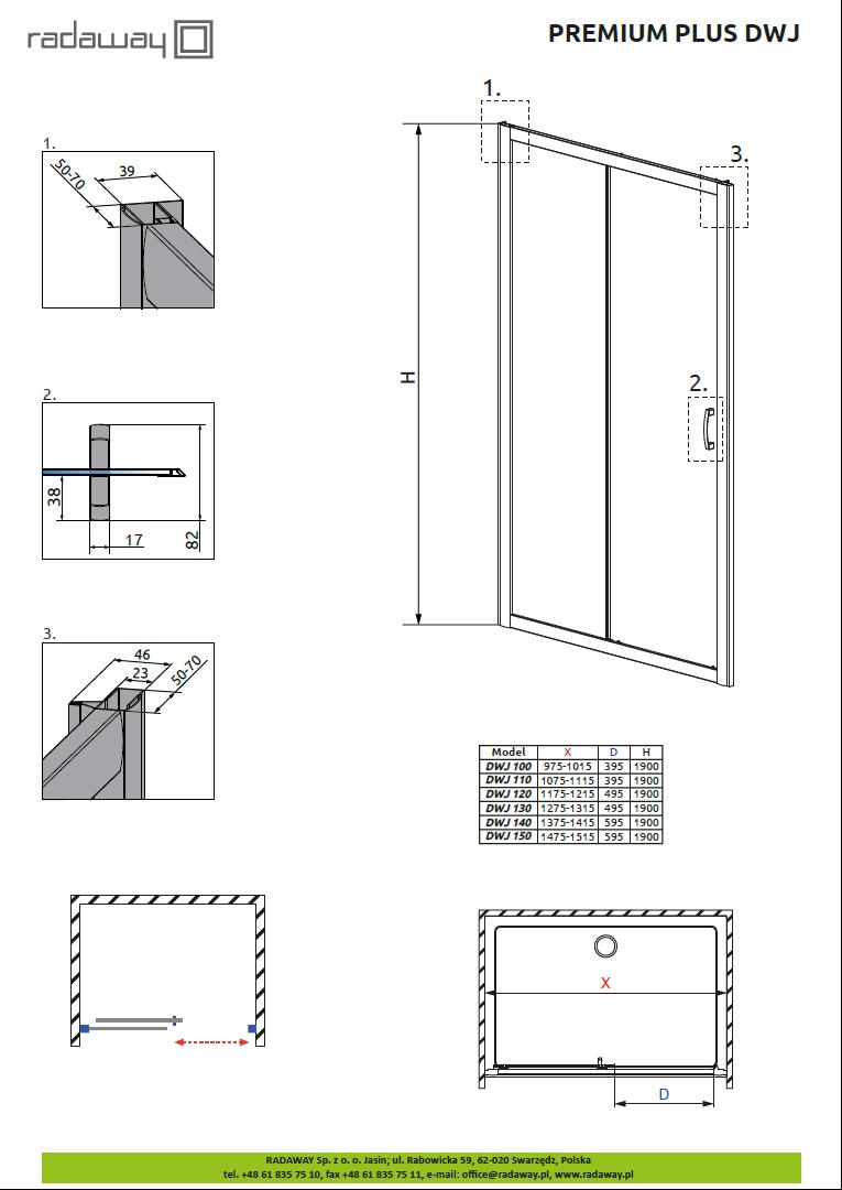 Раздвижная дверь для душевой ниши. Безопасное закалённое стекло толщиной 5 мм, согласно стандарту PN:EN 12150:1. Стекло крепится к стене с помощью пристенных профилей (с регулировкой). Подшипниковые, двойные ролики с хромированной крышкой. Элегантная хромированная фурнитура. Магнитный уплотнитель обеспечивает герметичность кабины. Эту душевую кабину возможно установить так на поддоне, как и непосредственно на пол. Защитное покрытие помогает содержать чистоту на поверхности стекол. Благодаря водоотталкивающим свойствам капли воды не удерживаются на поверхности стекла и быстро стекают, не оставляя следа. Применение расширительных профилей увеличит габаритный размер душевой кабины либо двери на размер указанный в пиктограмме.