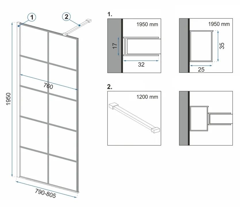 Душевая перегородка из закаленного безопасного стекла толщиной 8 мм. Алюминиевый профиль черного матового цвета. Размеры перегородки от 70 до 120 см. Дополнительно можно приобрести полку-полотенцедержатель.