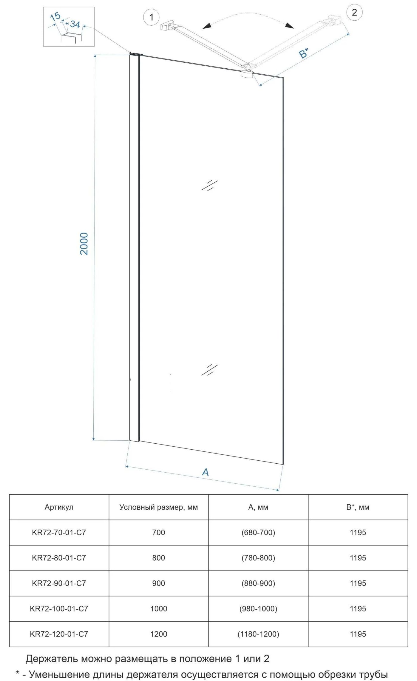 Стекло закалённое безопасное 8 мм. Профиль анодированный алюминий. Усиливающая пристенная штанга из нержавеющей стали - 1195 мм. Штангу можно подрезать под необходимый размер. Конструкция штанги поворотная и у стены и у стекла. Поддон приобретается отдельно.