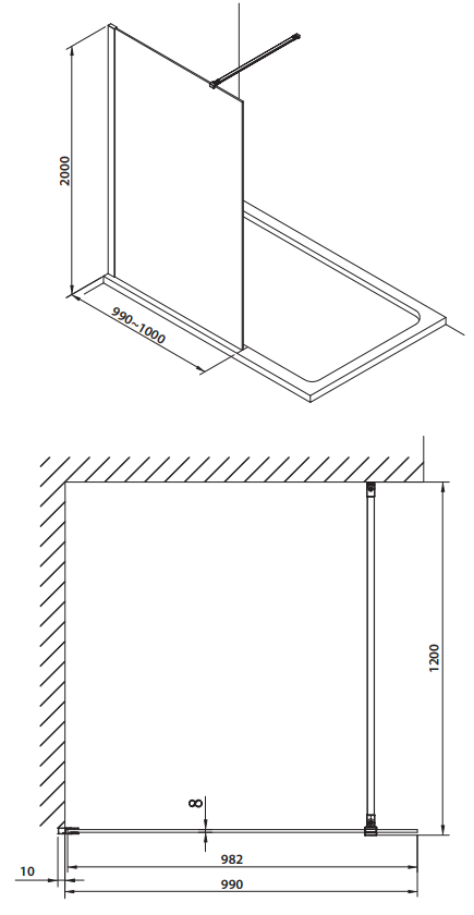 Максимальная длина кронштейна 120 см, высота стекла 200 см, стекло безопасное закаленное толщиной 8 мм, профили алюминиевые, регулировка профиля -1/+0 см, черная штанга, монтируемая на противоположной стене, позволяет самостоятельно уменьшать ее до необходимой длины.
