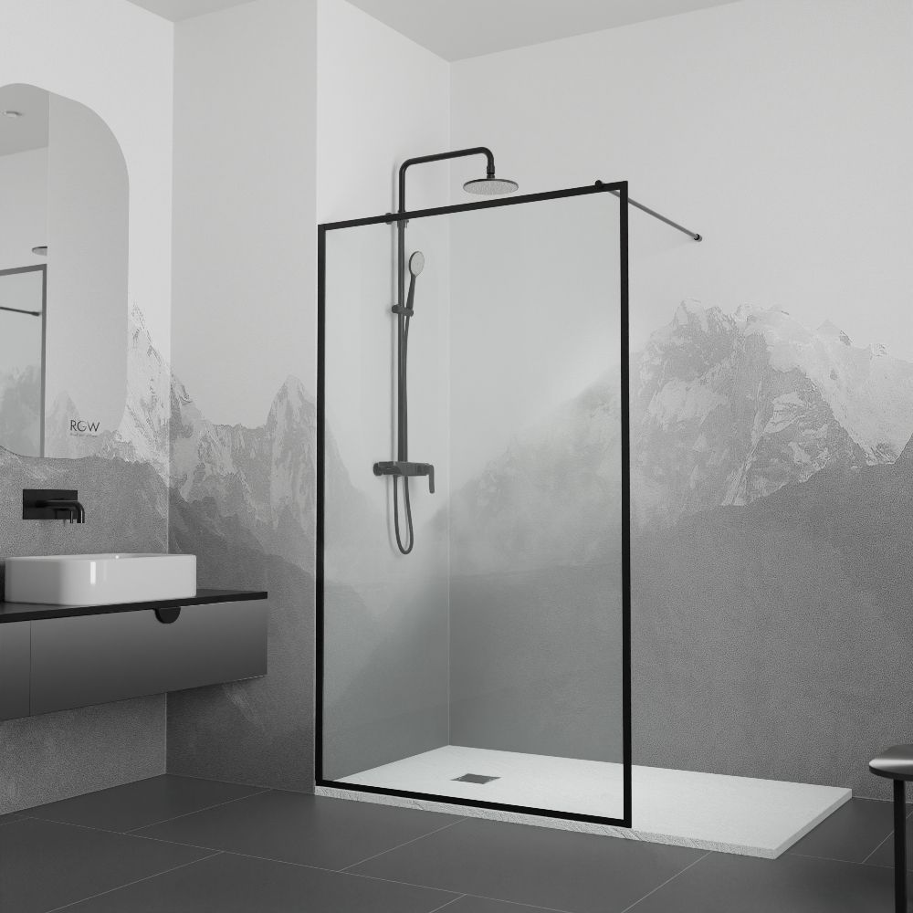 Душевая перегородка RGW WA-012B неподвижная с черным принтом. Трап или поддон приобретается отдельно.