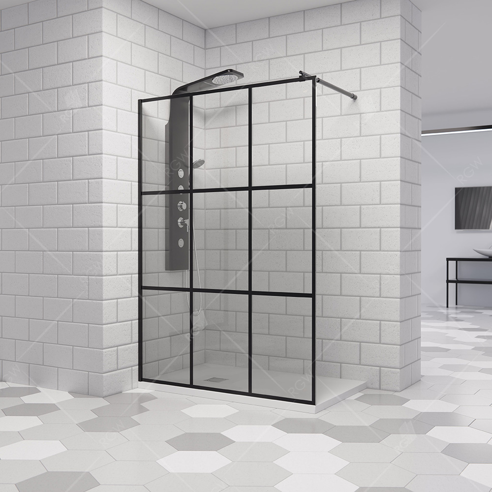 Душевая перегородка неподвижная. Черная печать шелкографии. Раздвижной телескопический держатель 1200 мм. Трап или поддон приобретается отдельно. Модели с размером 700, 800, 900, 1000 с рисунком 6 квадратов. Модели с размером 1200, 1400 с рисунком 9 квадратов.