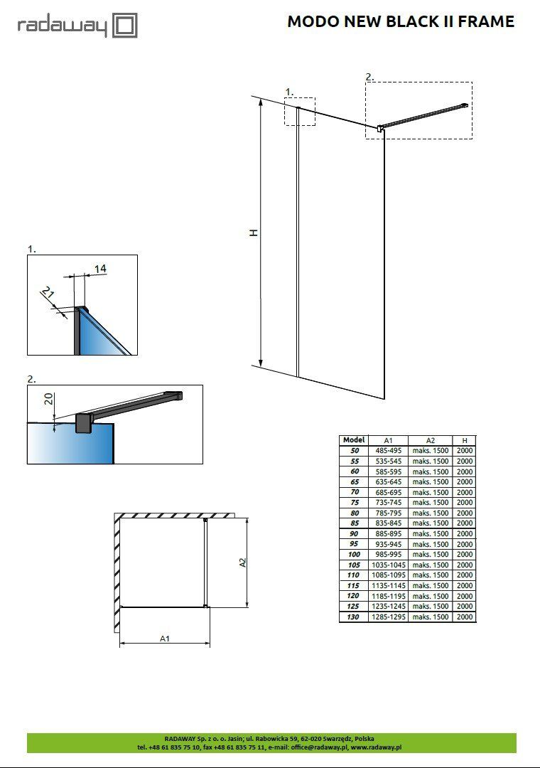 Безопасное закалённое стекло толщиной 8 мм, согласно стандарту PN:EN 12150:1. Стекло крепится к стене с помощью пристенных профилей (с регулировкой). Эту душевую перегородку возможно установить так на поддоне, как и непосредственно на пол. Защитное покрытие помогает содержать чистоту на поверхности стекол. Благодаря водоотталкивающим свойствам капли воды не удерживаются на поверхности стекла и быстро стекают, не оставляя следа. Это изделие подлежит модификациям. Изделие доступно в нескольких вариантах стекла. Возможность сделать гравировку на стекле. По умолчанию вся продукция укомплектована горизонтальными стабилизаторами. Если нет возможности прикрепить этот стабилизатор к стене, разрешите предложить Вам телескопический стабилизатор к потолку. Максимальная высота потолка 3 метра. Держатель для полотенец под заказ - крепится к 2 точкам на стекле, либо к стеклу и стене.