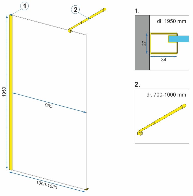 Представляем вам красивую, чрезвычайно функциональную и современную перегородку для душа. Это продукт, который идеально заполнит пространство вашей ванной комнаты, сохраняя при этом безупречный внешний вид и эстетику интерьера. Стена приспособлена для установки на душевой поддон или с линейным сливом. Он был изготовлен из качественного закаленного стекла. Золотые элементы были покрыты лазером четырехкратным покрытием эмали высочайшего качества. Благодаря этой технологии алюминиевые элементы стекла защищены от коррозии, потускнения и изменения цвета.