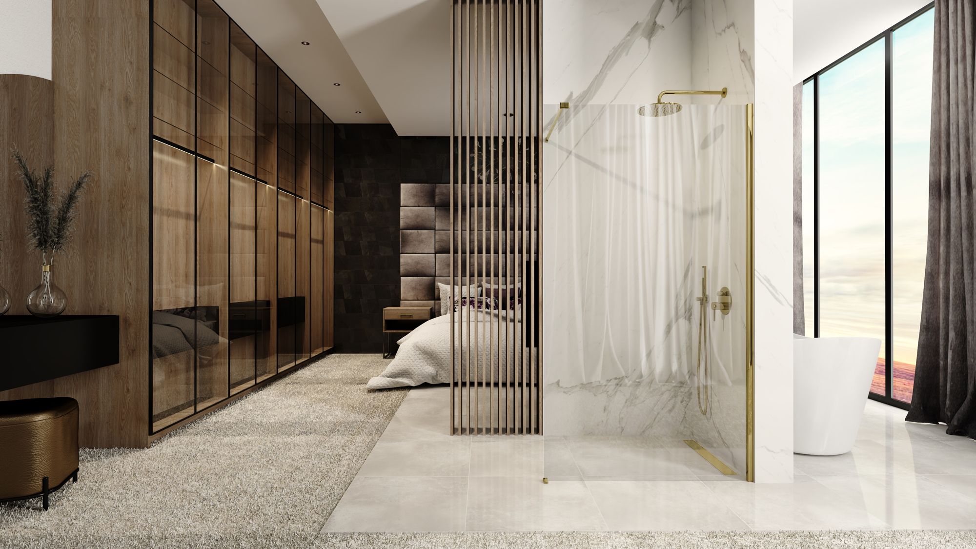 Представляем вам красивую, чрезвычайно функциональную и современную перегородку для душа. Это продукт, который идеально заполнит пространство вашей ванной комнаты, сохраняя при этом безупречный внешний вид и эстетику интерьера. Стена приспособлена для установки на душевой поддон или с линейным сливом. Он был изготовлен из качественного закаленного стекла. Золотые элементы были покрыты лазером четырехкратным покрытием эмали высочайшего качества. Благодаря этой технологии алюминиевые элементы стекла защищены от коррозии, потускнения и изменения цвета.