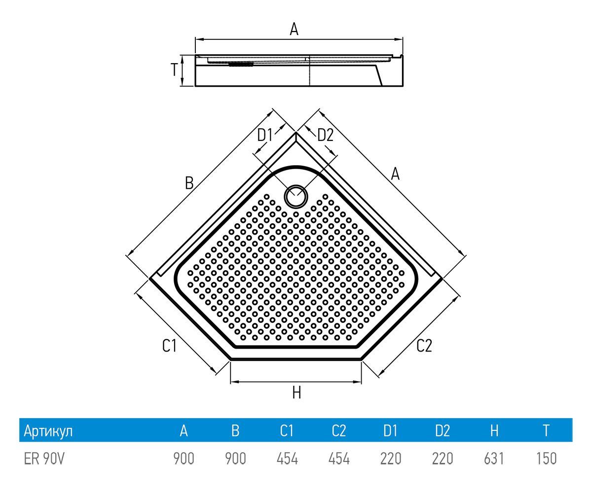 Пятиугольный поддон 90x90, 100x100, высота поддона - 15, отверстие под сифон Ø 90 мм. Душевой уголок рекомендуется устанавливать только на фирменный поддон Erlit пятиугольной формы.
