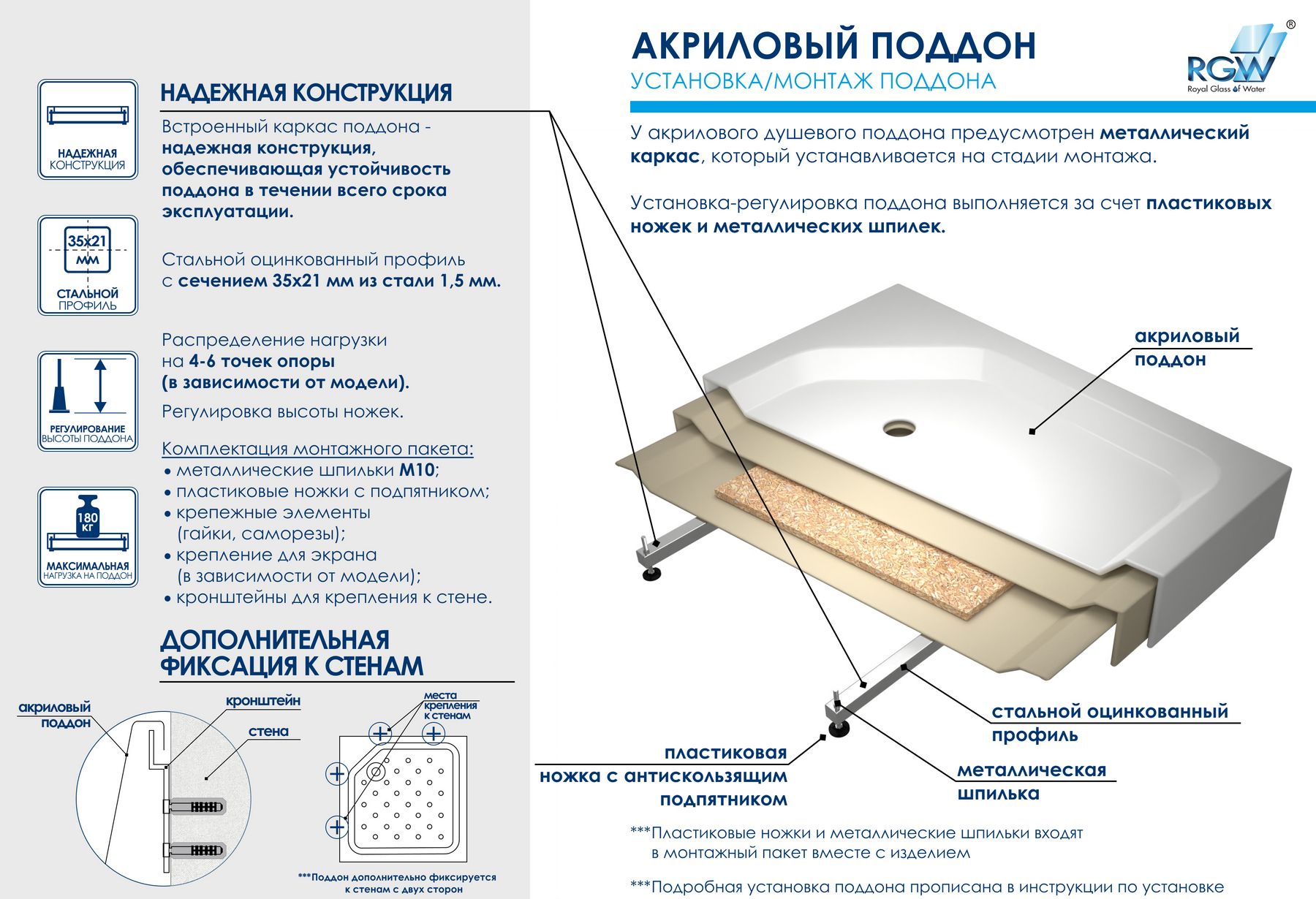 Толщина акриловой формы составляет 3 мм и дополнительно усилена напылением стеклопластика и применением внутреннего закладного элемента - пластины ДСП толщиной 16 мм для большей прочности и надежности конструкции - поддон способен выдержать нагрузку до 180 кг.