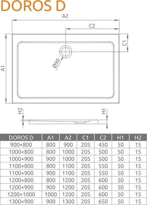 Плоский прямоугольный поддон для монтажа непосредственно на пол (необходимо приклеить на раствор или пену с низким коэффициентом расширения) 90x80, 100x80, 100x90, 110x80, 110x90, 120x80, 120x90, 120x100, 130x90, высота поддона - 5 см, отверстие под сифон Ø 90 мм