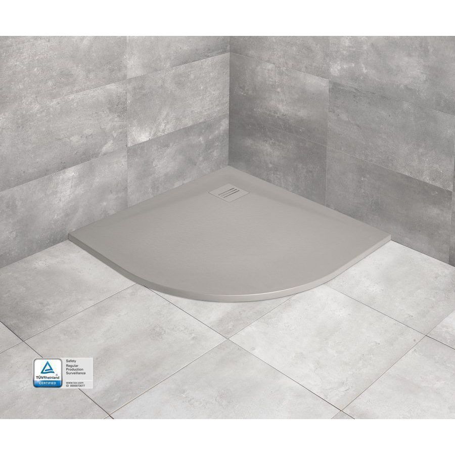 Плоский поддон для душа в форме "четверть круга" из искусственного мрамора в сером цвете. Возможен монтаж вровень с полом, на полу, а также на подиуме из кирпича. Поверхность можно легко очистить. Антискользящая поверхность. Сливное отверстие Ø 90 мм. Решетка слива из нержавеющей стали не входит в комплект и приобретается отдельно в предложенных цветах на выбор. Под заказ возможна подрезка поддона до необходимых размеров и окраска подрезанной кромки поддона.