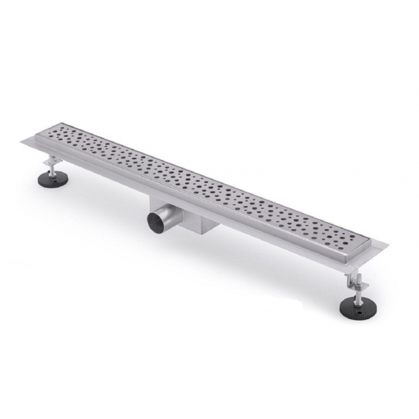 Трап-лоток с гидрозатвором (защита от запаха), решетка с круглой ячейкой, длина решетки от 45 до 85 см, ширина решетки 7 см.