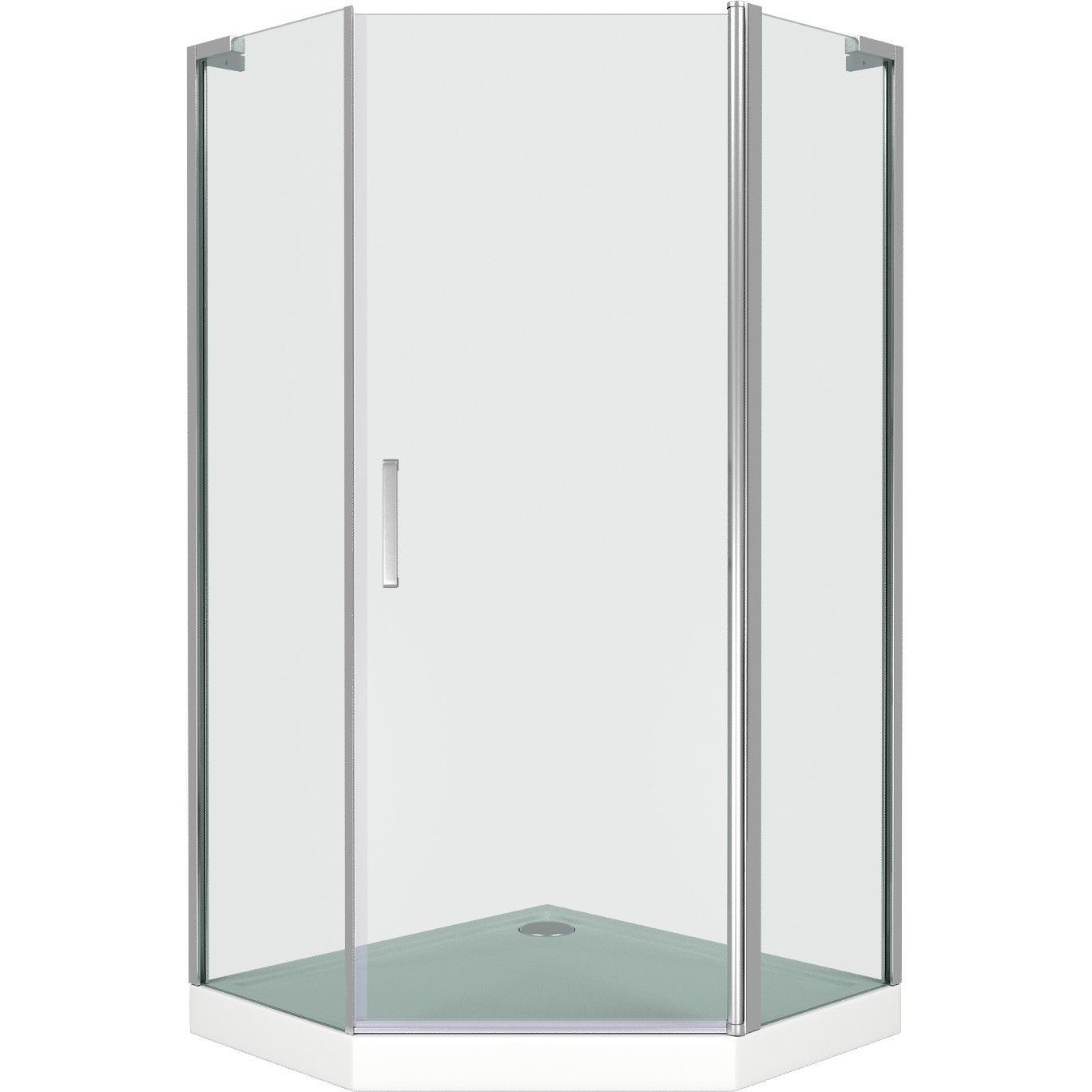 Пятиугольный душевой уголок с распашной дверью с подъемным механизмом. Безопасное закаленное стекло толщиной 6 мм.