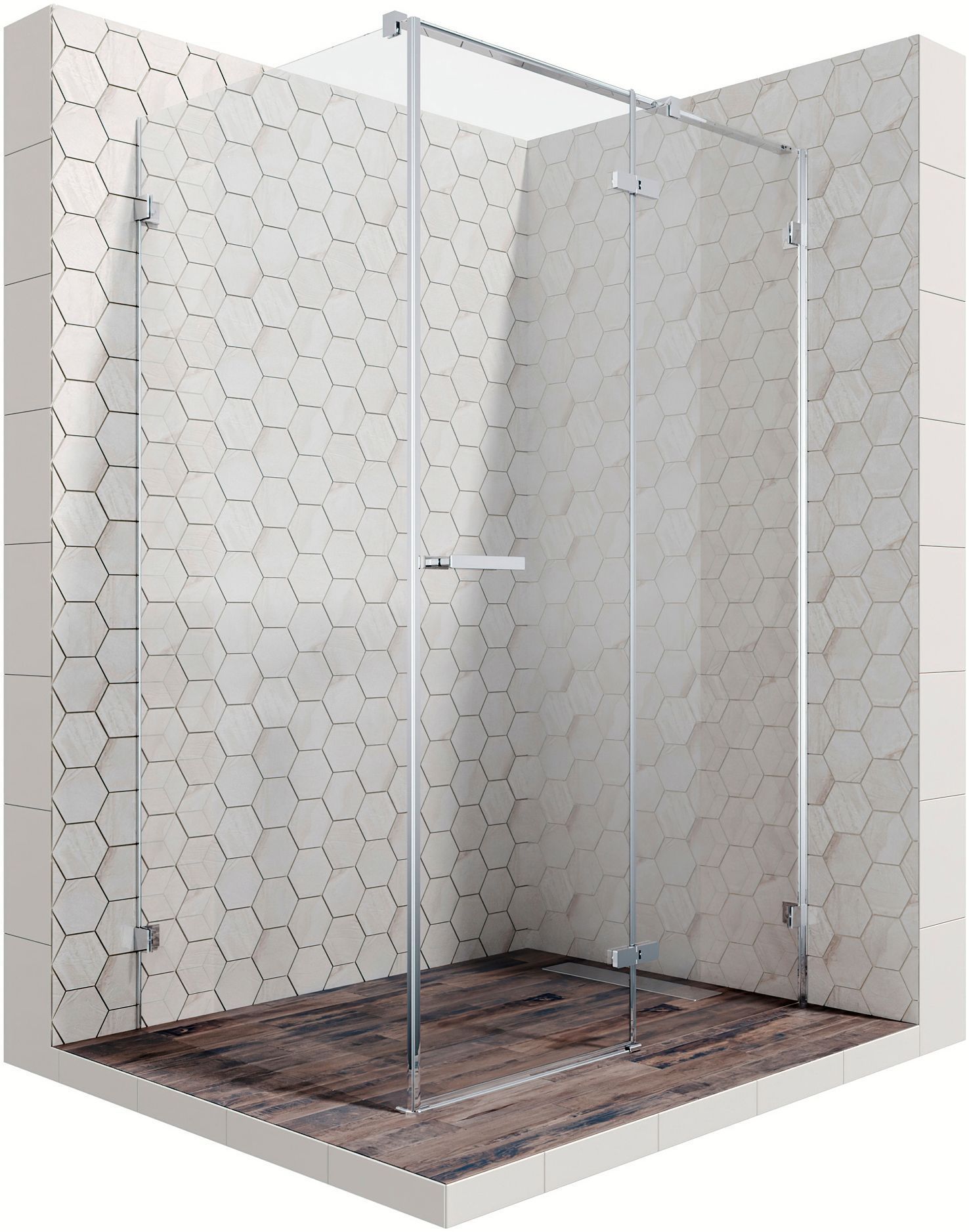 Максимальная свобода в проектировании. Ограждение может быть установлено на поддон (подиум) или непосредственно на пол, с линией стекла или краем профиля вдоль границы керамической плитки со встроенным душевым каналом или трапом.