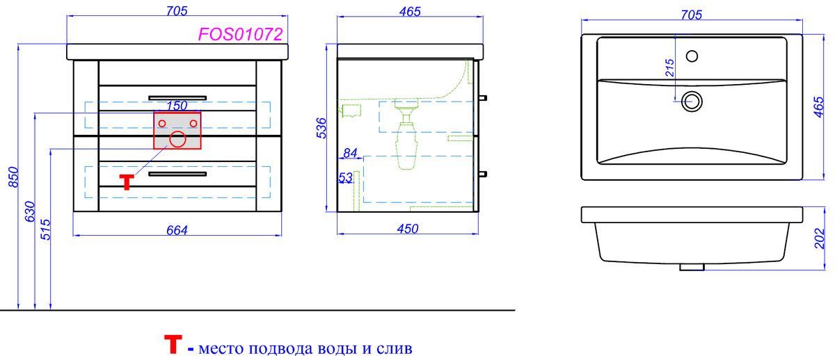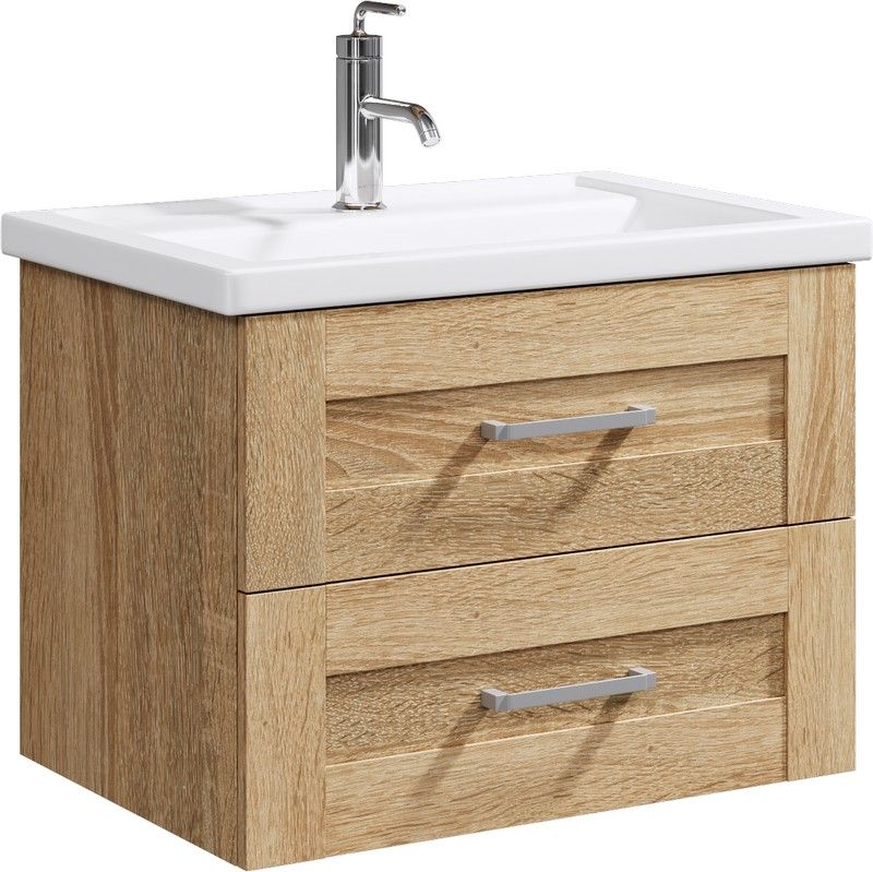 Мебель доступна в цвете дуб сонома. Коллекция представлена трех размерах: 60, 70 и 80 см по ширине. Ящики тумб оснащены скрытыми направляющими австрийской фирмы Blum с системой мягкого закрывания, на которые производитель дает вечную гарантию, внутри ящика – ЛДСП серого цвета. Керамический умывальник Kirovit входит в комплект.