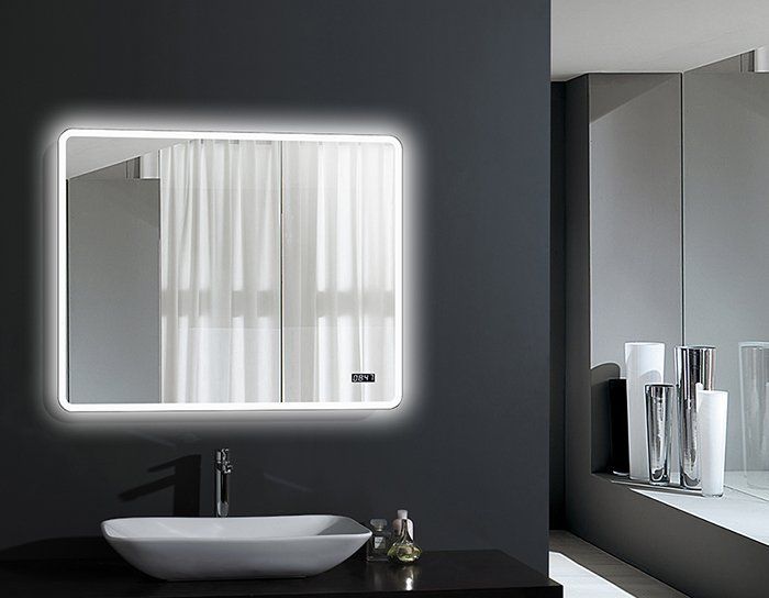 Прямоугольное зеркало для ванной комнаты. Светодиодная подсветка, сенсорное включение, подогрев зеркала, встроенные часы. Материал зеркала - металл. Мощности зеркал: 42, 51, 51, 76, 96 Вт. Вертикальная и горизонтальная навеска.