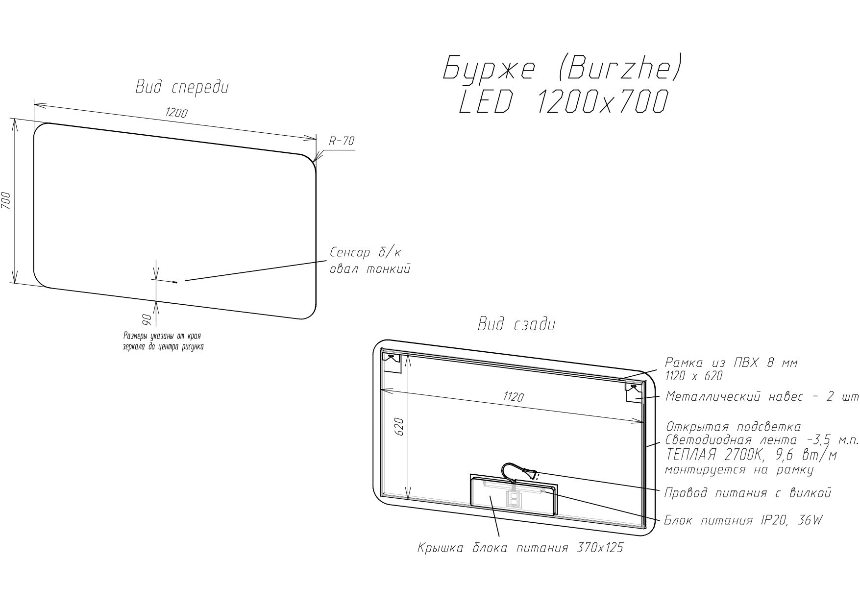 Материал корпуса пластик. Зеркальное полотно AGC Glass Europe 4 мм. Температура свечения LED - 6000K. Тип светодиодов: 2835(120). Электропитание: 220V/50Hz. Класс защиты: IP44. Стандартная комплектация: теплая LED подсветка, бесконтактный диммируемый овальный сенсор.
