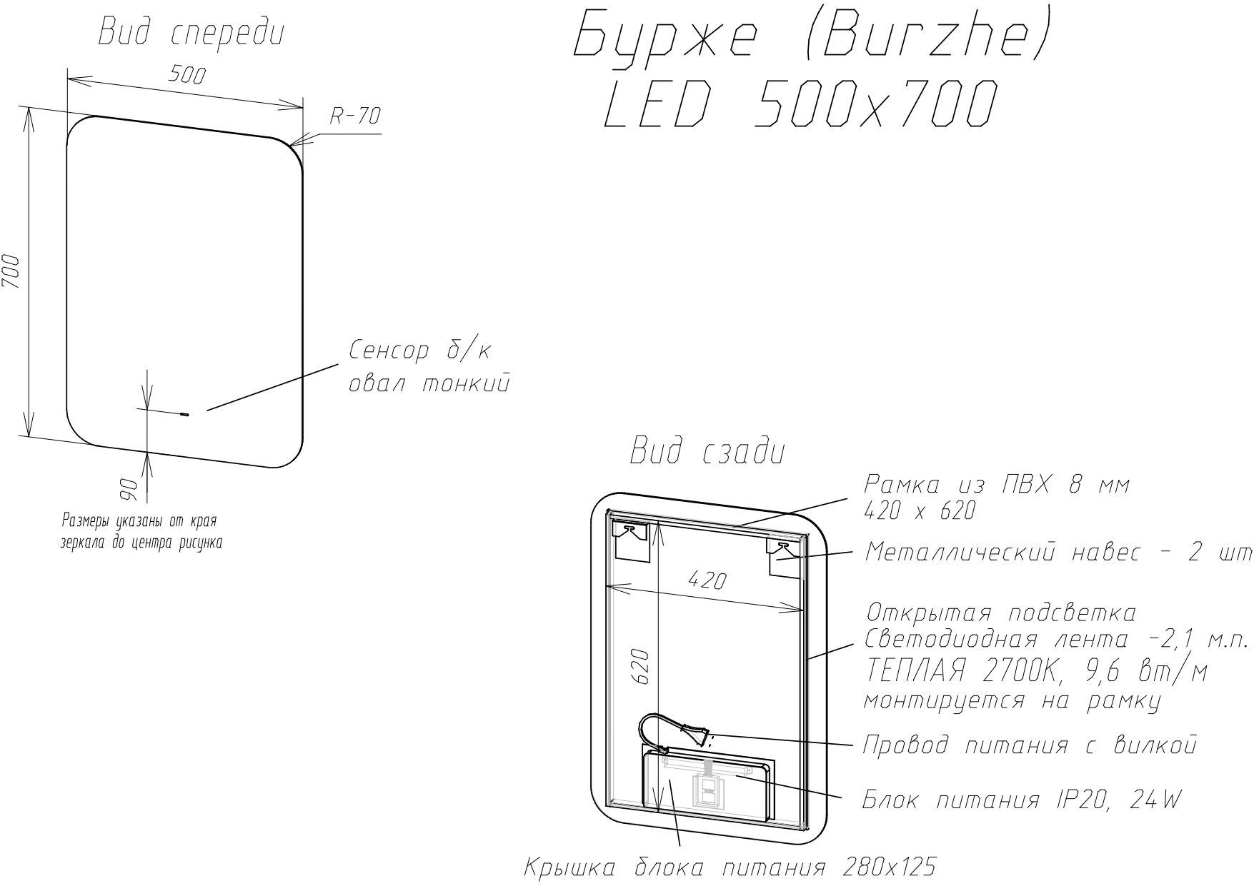 Материал корпуса пластик. Зеркальное полотно AGC Glass Europe 4 мм. Температура свечения LED - 6000K. Тип светодиодов: 2835(120). Электропитание: 220V/50Hz. Класс защиты: IP44. Стандартная комплектация: теплая LED подсветка, бесконтактный диммируемый овальный сенсор.