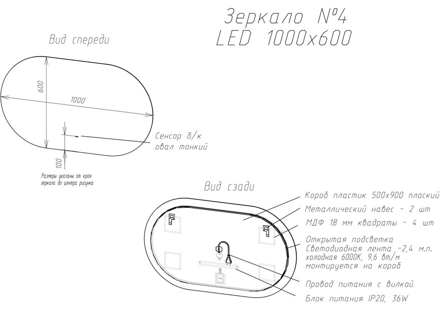 Материал корпуса пластик. Зеркальное полотно AGC Glass Europe 4 мм. Температура свечения LED - 6000K. Тип светодиодов: 2835(120). Электропитание: 220V/50Hz. Класс защиты: IP44. Стандартная комплектация: ореольная теплая подсветка, бесконтактный диммируемый овальный сенсор.