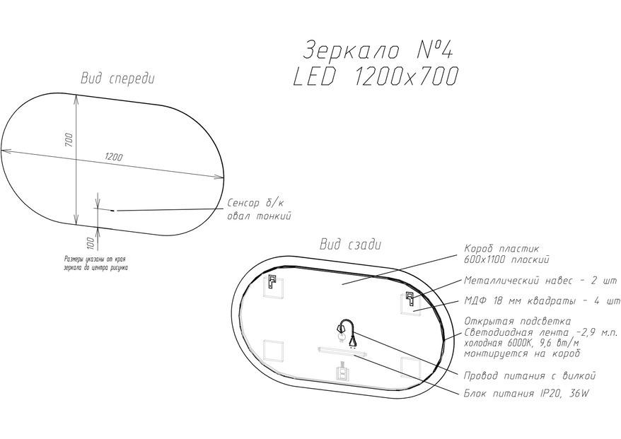 Материал корпуса пластик. Зеркальное полотно AGC Glass Europe 4 мм. Температура свечения LED - 6000K. Тип светодиодов: 2835(120). Электропитание: 220V/50Hz. Класс защиты: IP44. Стандартная комплектация: ореольная теплая подсветка, бесконтактный диммируемый овальный сенсор.