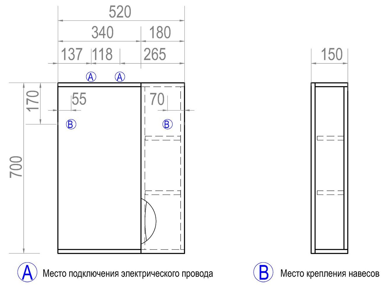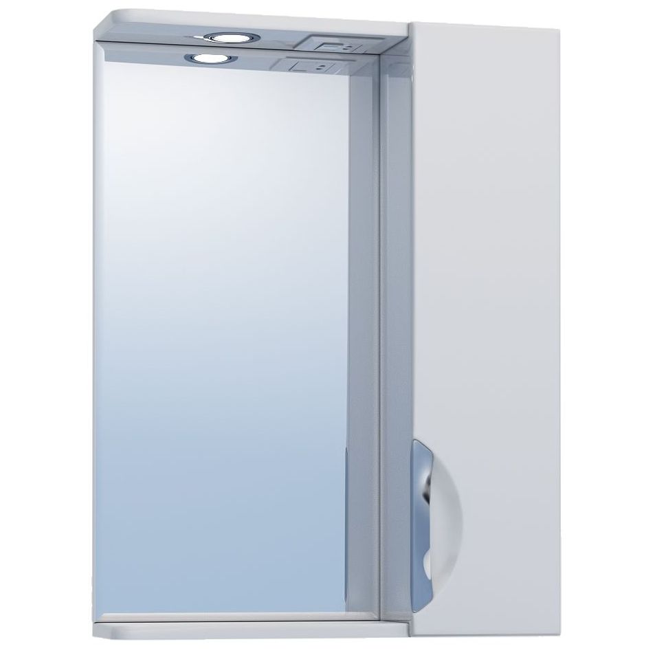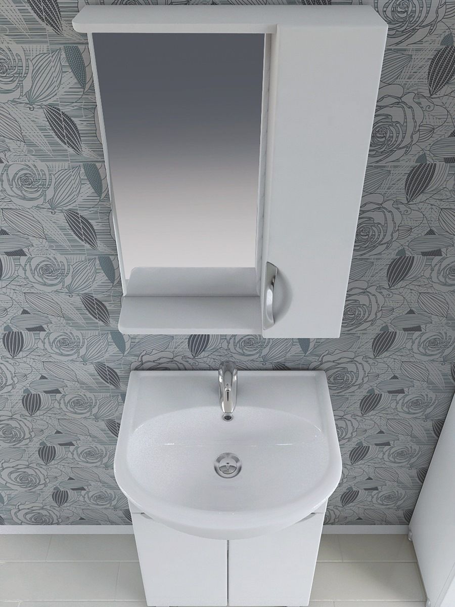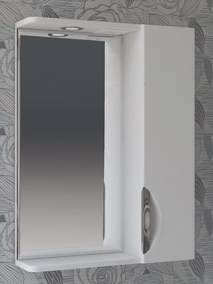 Материал корпуса: влагостойкая ЛДСП. Материал фасадов: ЛМДФ. Покрытие: пленка ПВХ. Дверцы: петли с механизмом плавного закрывания. Зеркало со спотом. 2 полки ЛДСП. Ручка металлическая хромированная. 1 светодиодный светильник, включатель с розеткой.