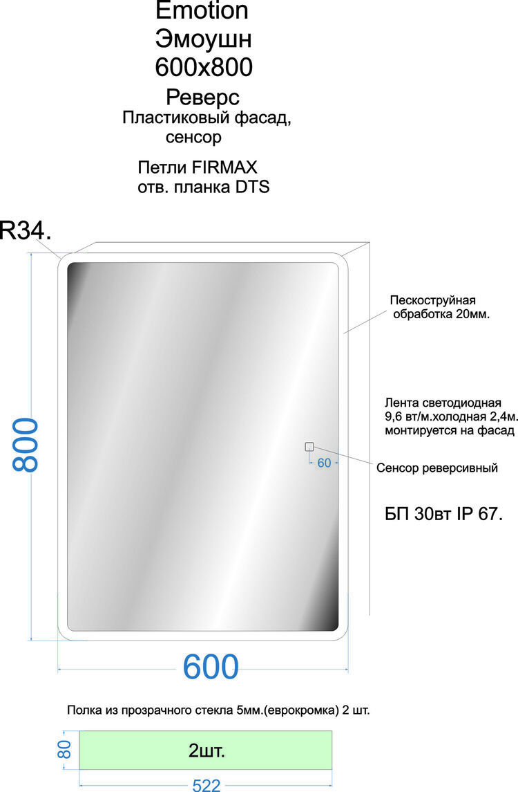 Корпус зеркального шкафа из МДФ в пленке ПВХ, светодиодная подсветка с температурой свечения 6000K, тип светодиодов 2835(120), питание 220 В/50 Гц, класс защиты IP44, зеркальное полотно AGC Glass Europe 4 мм, фурнитура Firmax, стеклянные полки. Комплектация: LED подсветка, датчик движения, реверс.