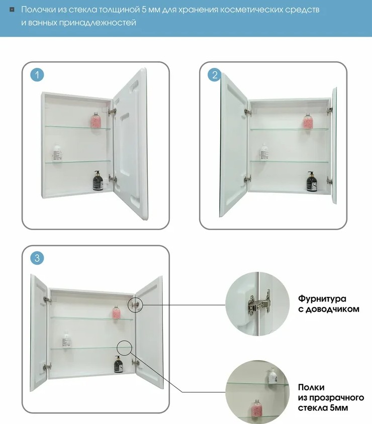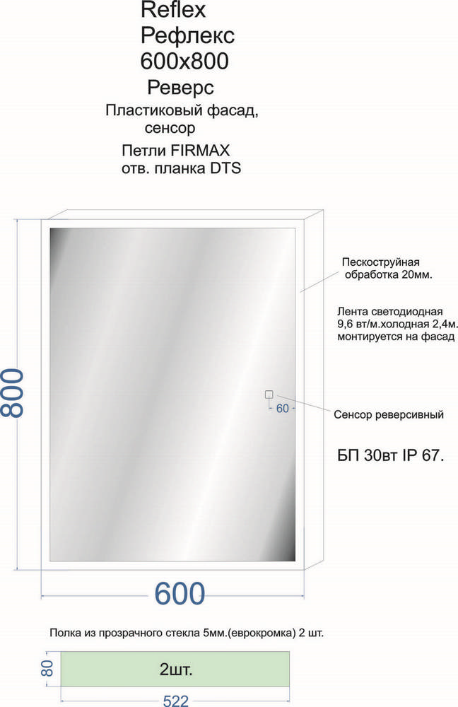 Корпус зеркального шкафа из МДФ в пленке ПВХ, светодиодная подсветка с температурой свечения 6000K, тип светодиодов 2835(120), питание 220 В/50 Гц, класс защиты IP44, зеркальное полотно AGC Glass Europe 4 мм, фурнитура Firmax, стеклянные полки. Комплектация: LED подсветка, датчик движения, реверс.