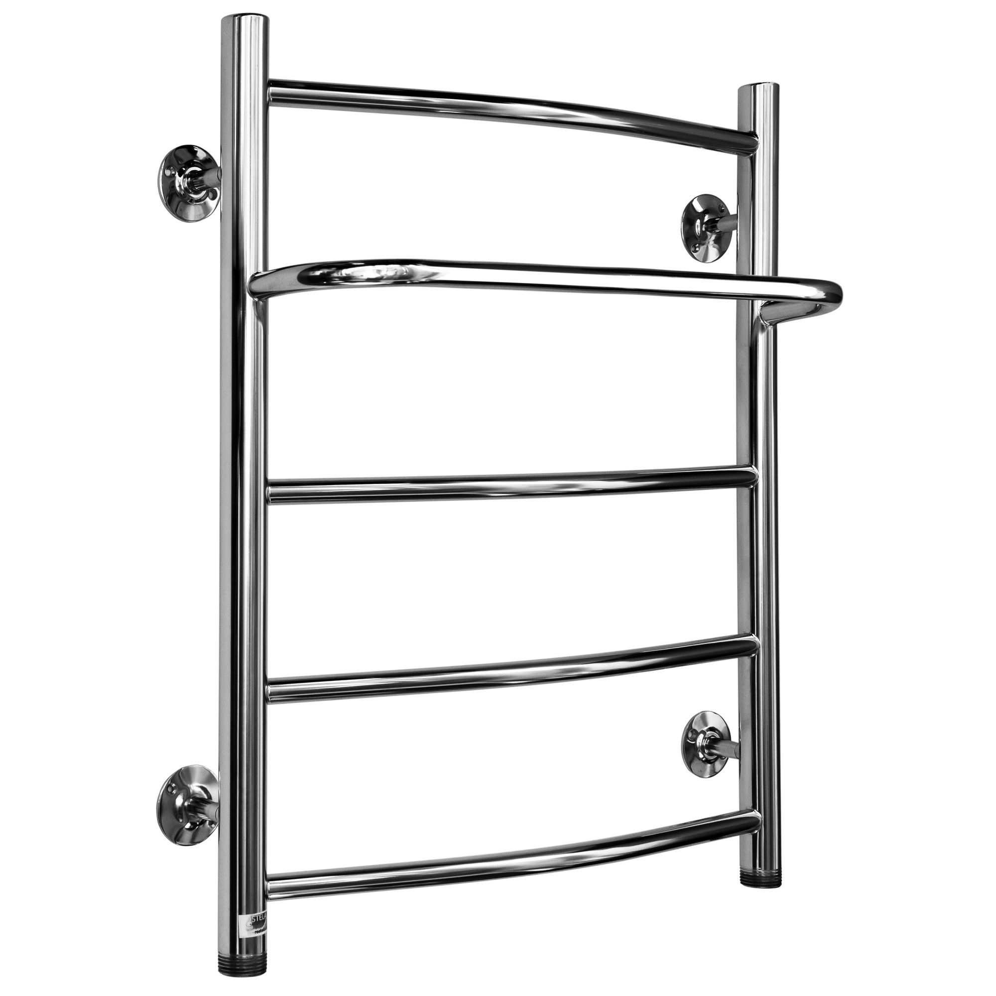 Водяной полотенцесушитель из нержавеющей стали в виде лесенки с полкой, перекладины в виде дуги, полка в виде скобы. Тепловая мощность: 249, 265, 355, 400 Вт.
