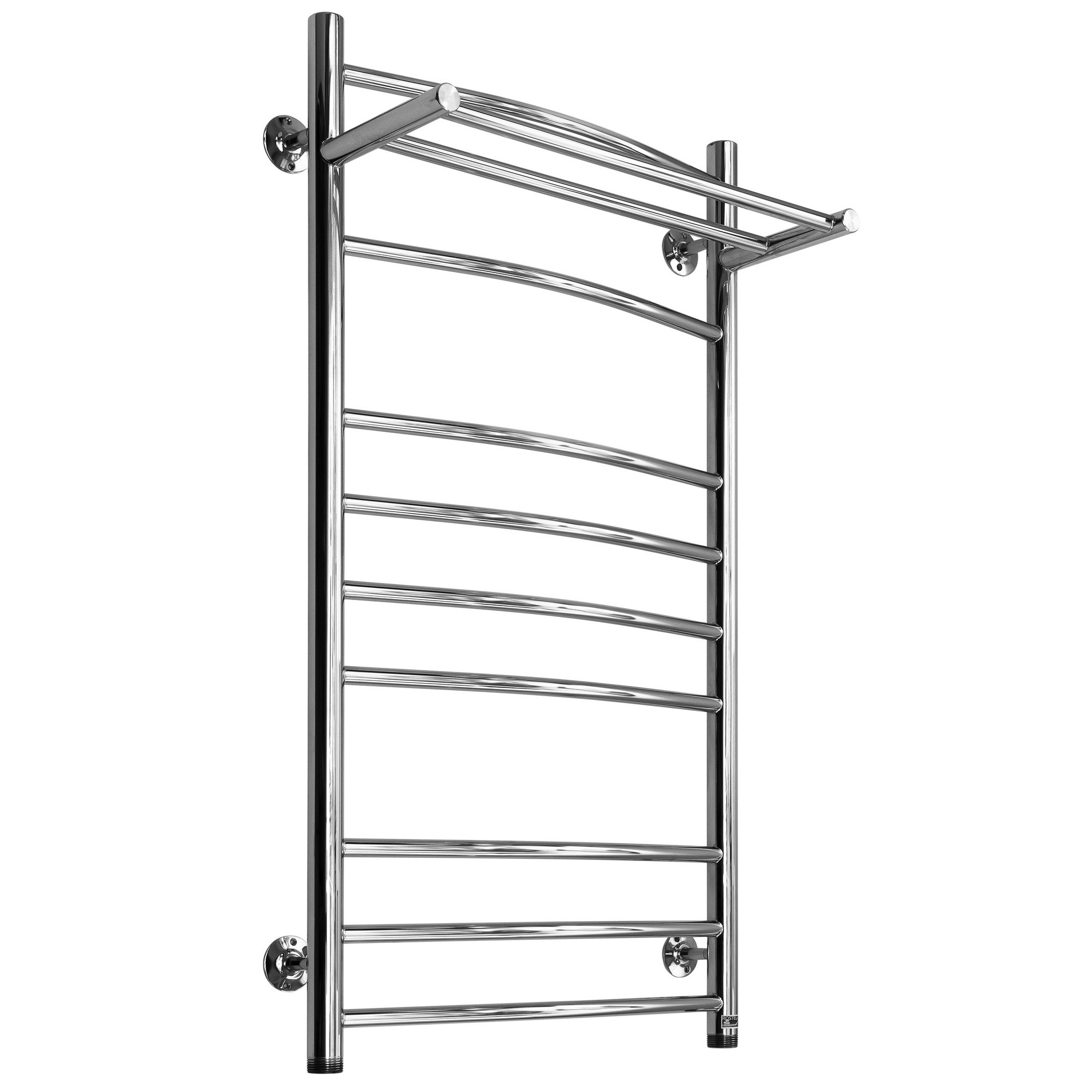 Водяной полотенцесушитель из нержавеющей стали в виде лесенки с полкой, перекладины в виде дуги. Тепловая мощность: 343, 414, 476 Вт.