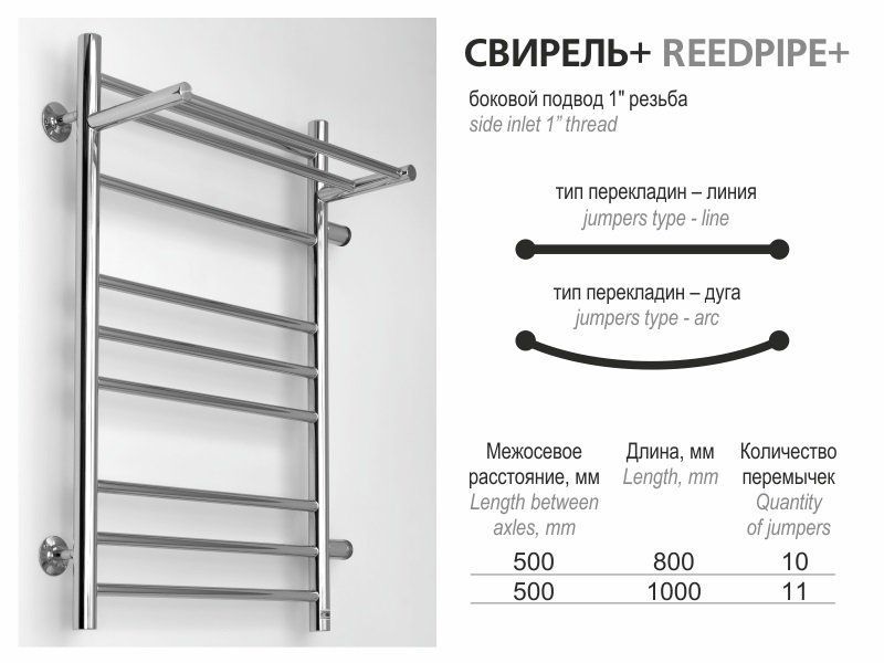 Водяной полотенцесушитель из нержавеющей стали в виде лесенки с полкой, перекладины в виде дуги. Тепловая мощность: 343, 414, 476 Вт.