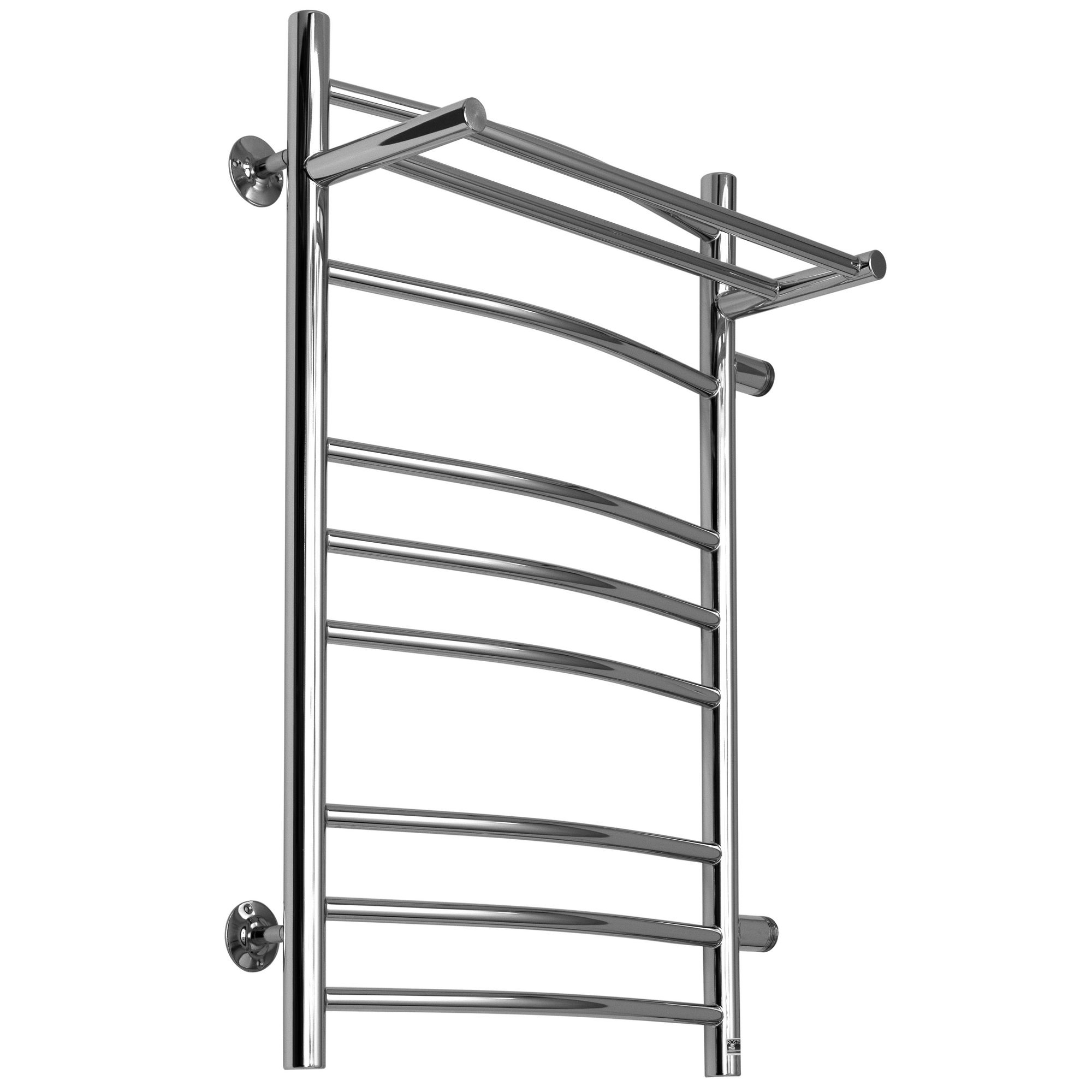 Водяной полотенцесушитель из нержавеющей стали в виде лесенки с полкой, перекладины в виде дуги. Тепловая мощность: 343, 414, 476 Вт.