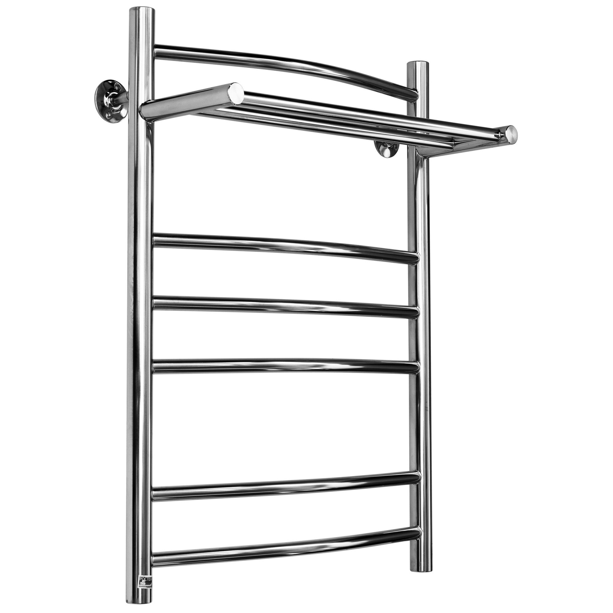 Водяной полотенцесушитель из нержавеющей стали в виде лесенки с полкой, перекладины в виде дуги. Тепловая мощность: 343, 414, 476 Вт.