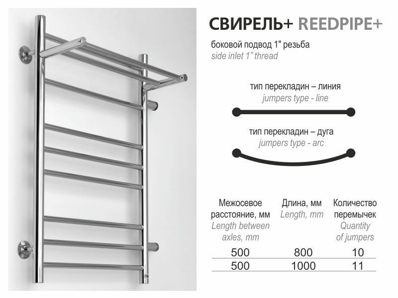 Данный полотенцесушитель с полочкой и поперечными прямыми перекладинами идеально подходит в квартиры, где раньше стояли простые М или П-образные полотенцесушители и имеется действующий выход 500 мм. Тем самым можно без особых затрат улучшить красоту Вашей ванной комнаты. Тепловая мощность: 414, 476 Вт