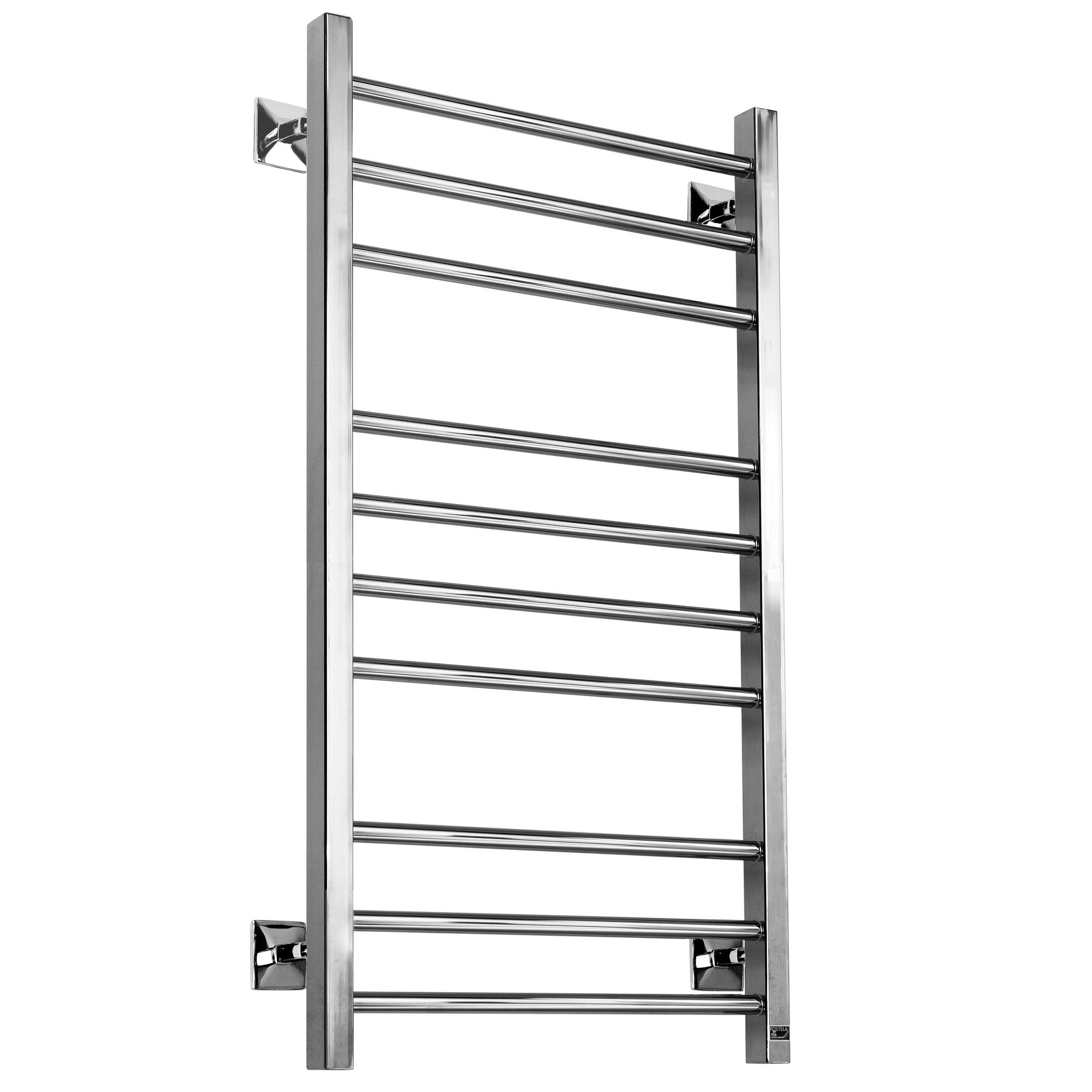 Водяной полотенцесушитель из нержавеющей стали "лесенка" с перекладинами в виде линии. Боковые стойки квадратного сечения. Тепловая мощность: 296, 366, 424 Вт.